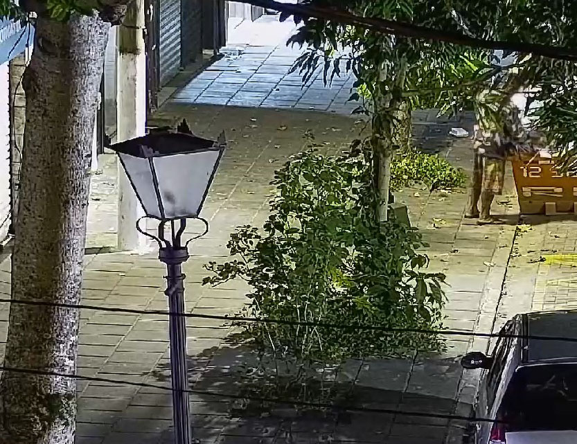 As imagens mostram o momento em que o indivíduo circula pela via pública, pega um pedaço de madeira e utiliza o objeto para arrombar a porta do comércio, entrando em seguida no imóvel.