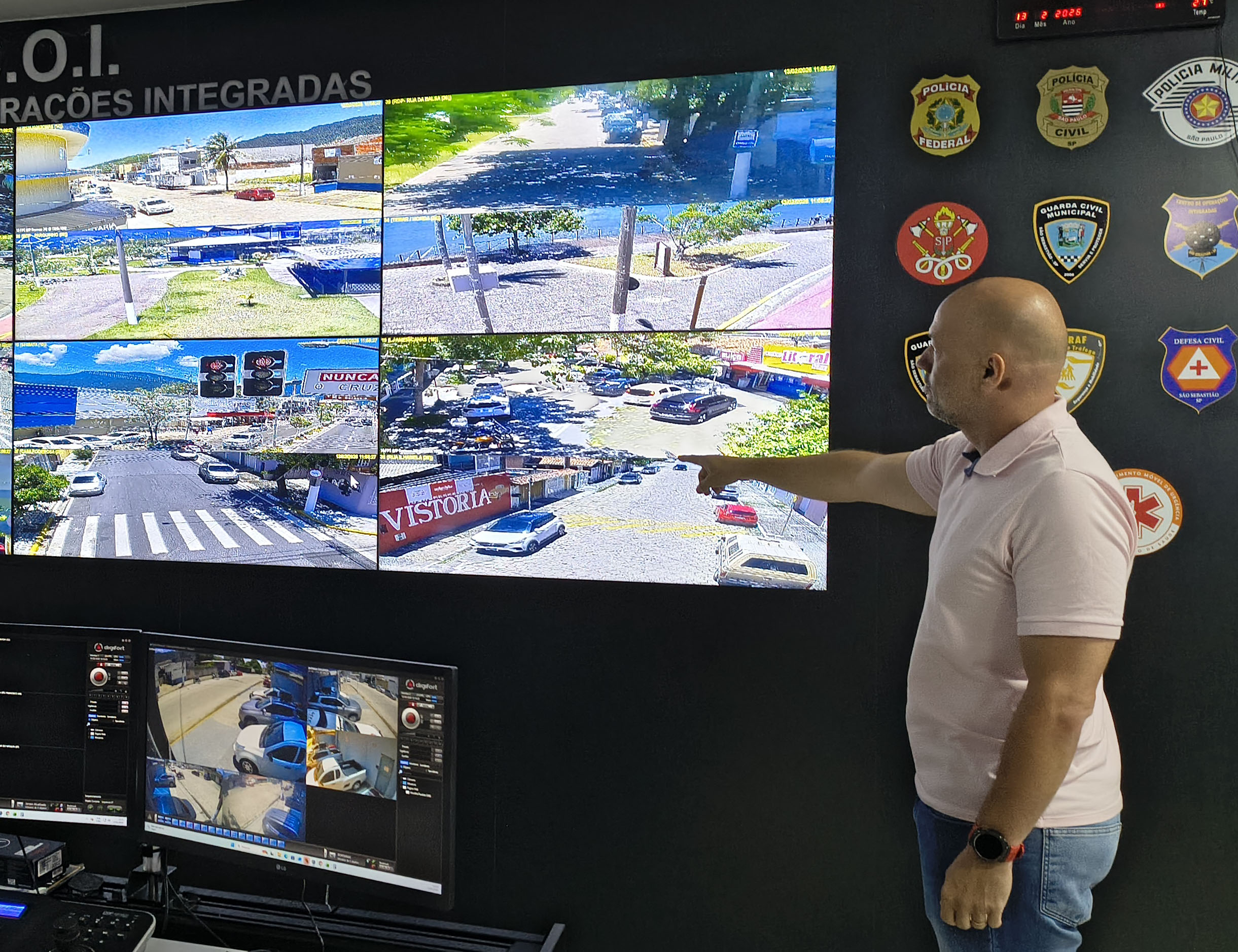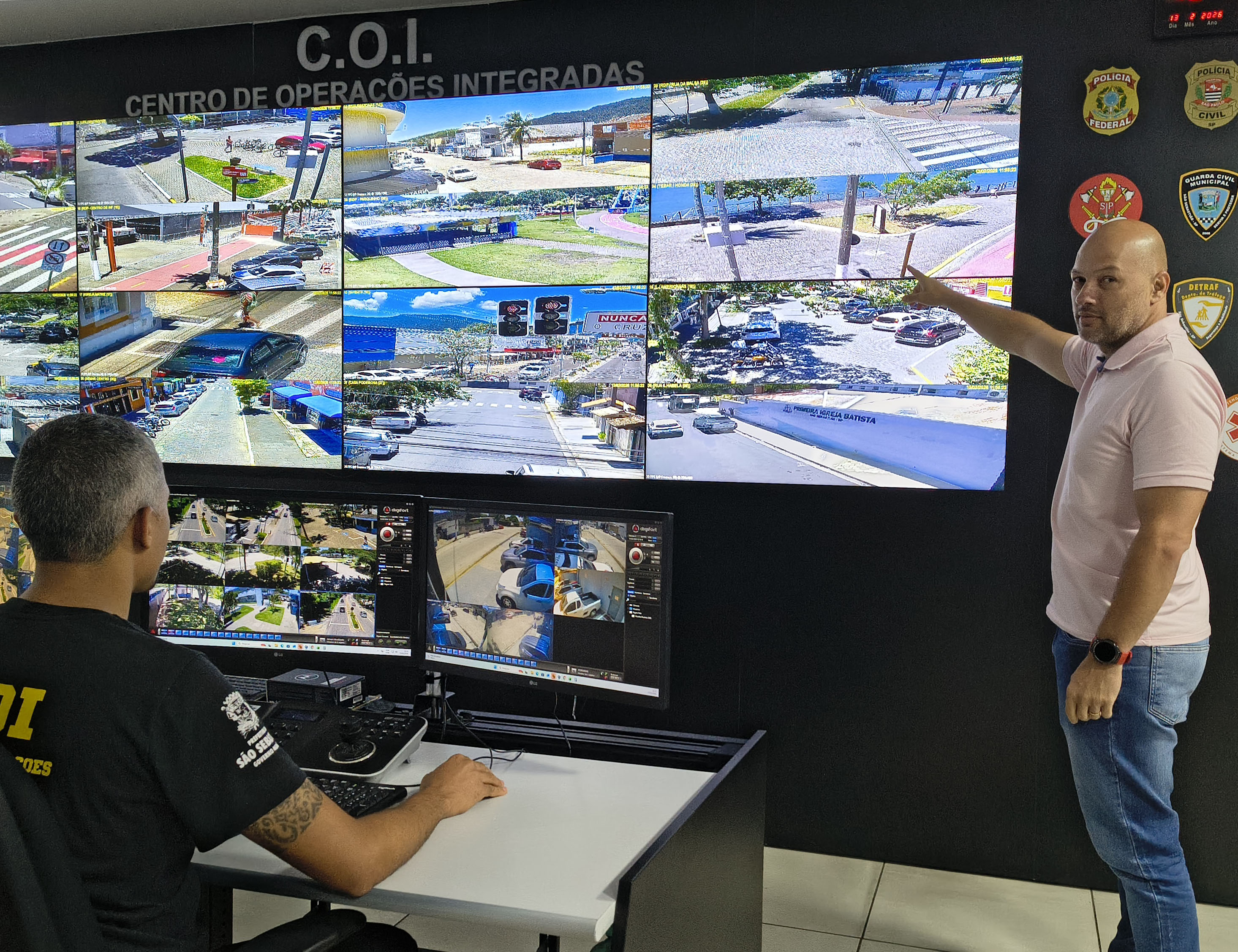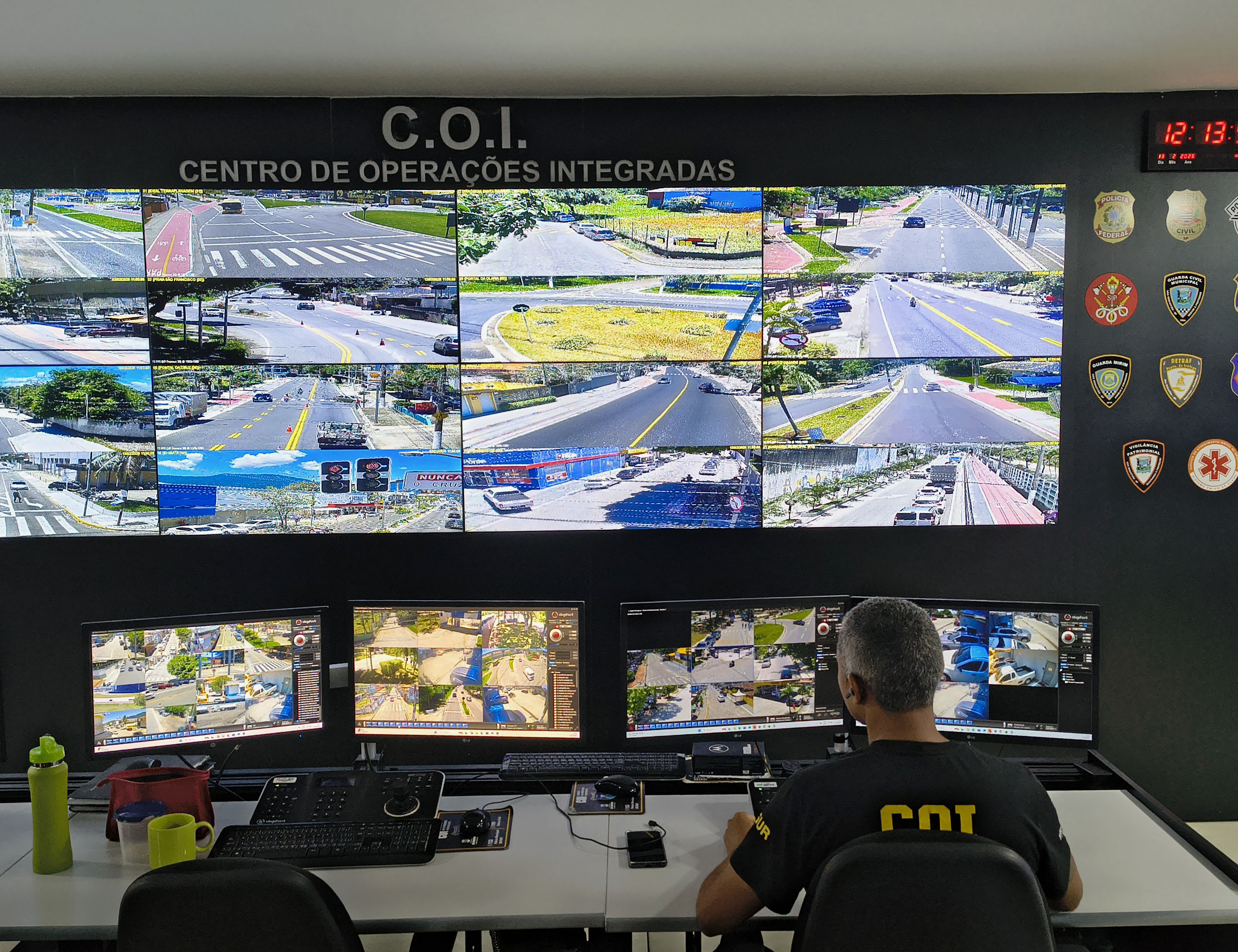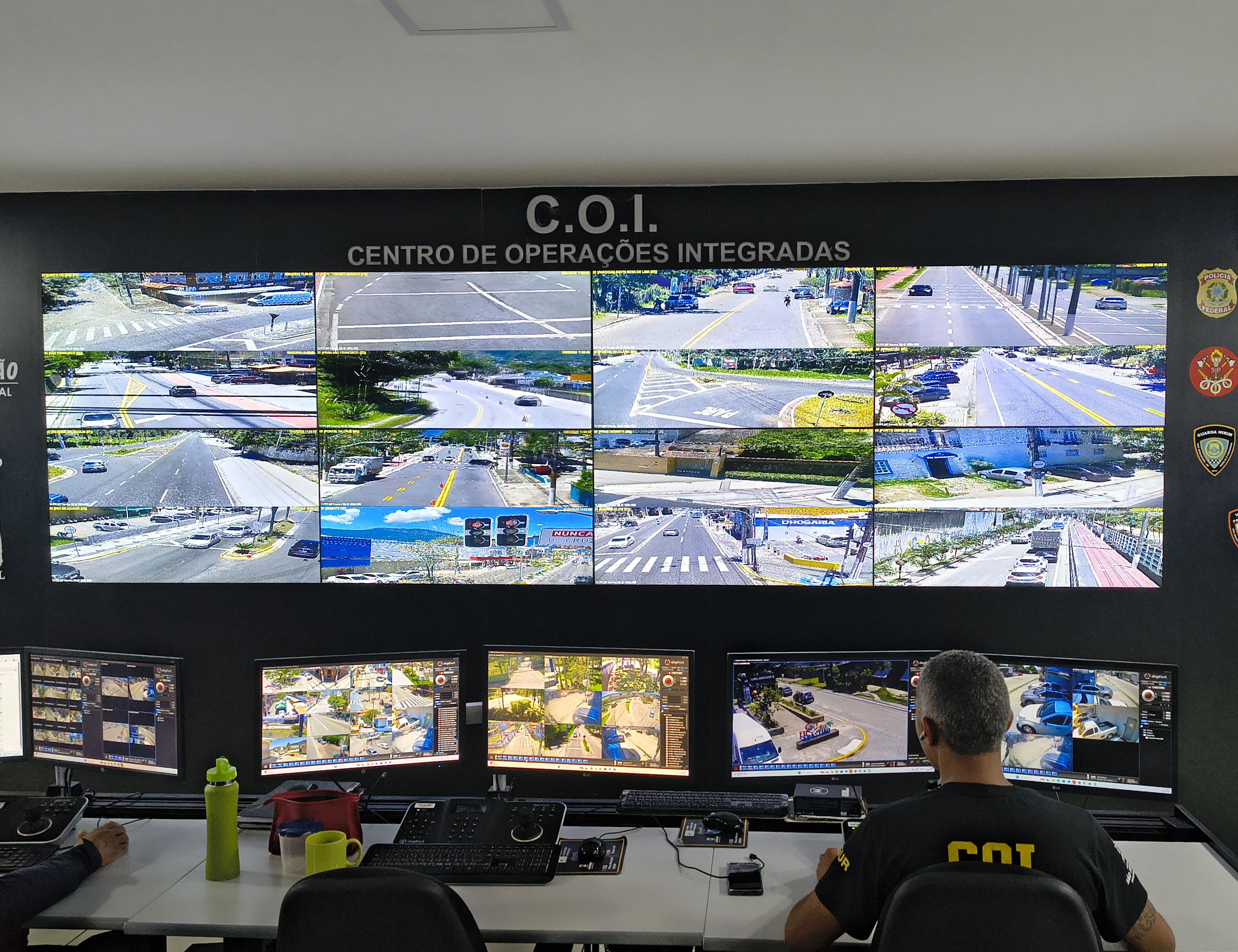#PraTodosVerem: Sequência de imagens mostra o interior do C.O.I. (Centro de Operações Integradas), uma sala de monitoramento com um grande videowall exibindo diversas câmeras de segurança de vias públicas. Operadores sentados à frente de monitores individuais controlam o sistema, enquanto um homem de camisa polo rosa aponta para detalhes nas telas principais. Na parede preta, destacam-se o letreiro do centro, um relógio digital vermelho e diversos brasões de forças de segurança, como Polícia Federal, Civil, Militar e Guarda Municipal. Fim da descrição.