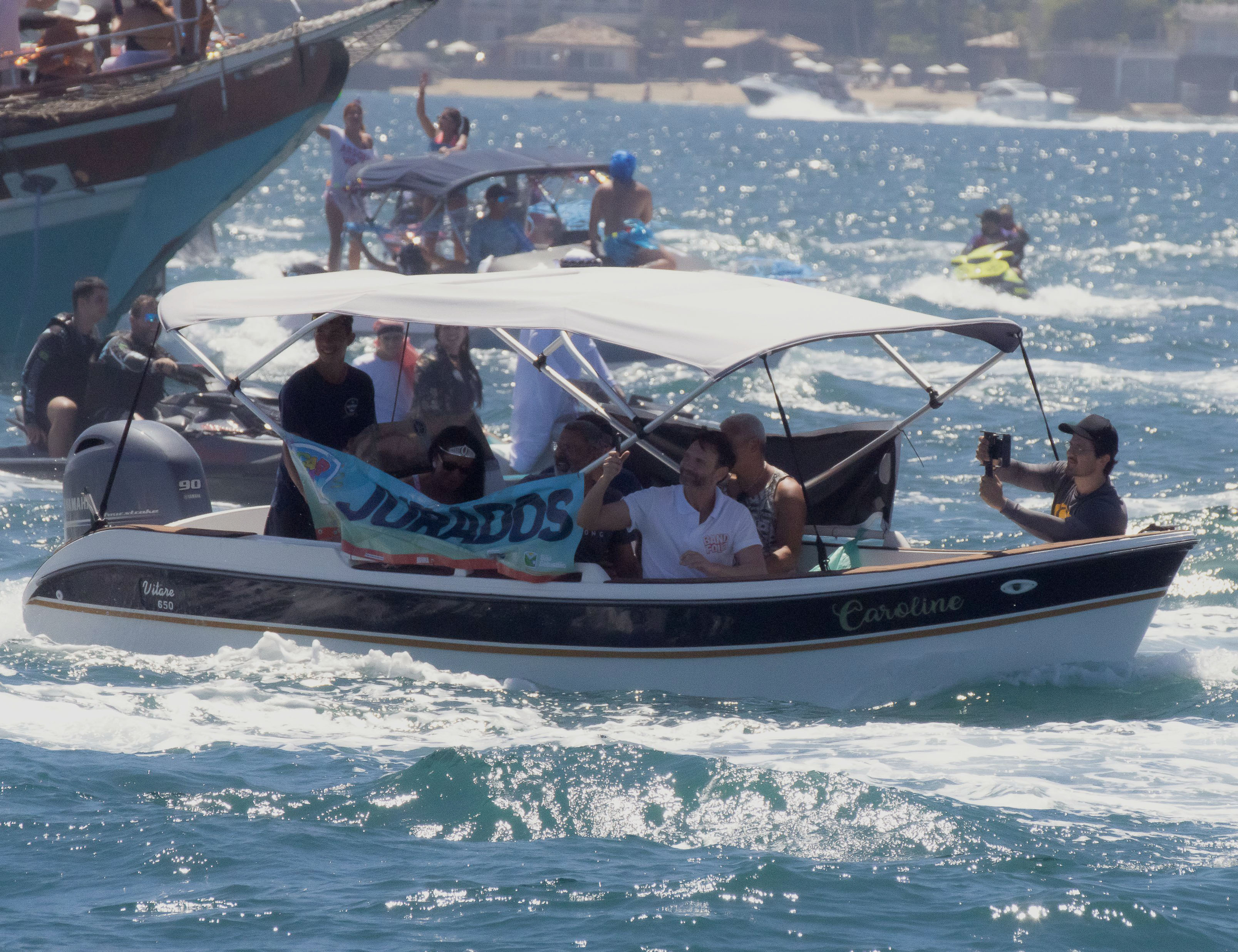 #PraTodosVerem: O conjunto de imagens registra o Carnamar, evento festivo no mar de São Sebastião, onde dezenas de embarcações, como lanchas, escunas e jet skis, navegam em águas azuis com montanhas ao fundo. Em destaque, um barco com tripulantes fantasiados de Smurfs, pintados de azul e usando gorros brancos sob balões claros, enquanto outra lancha transporta jurados com uma faixa colorida. O clima é de celebração sob sol forte, com pessoas acenando e comemorando em um desfile náutico vibrante e movimentado. Fim da descrição.