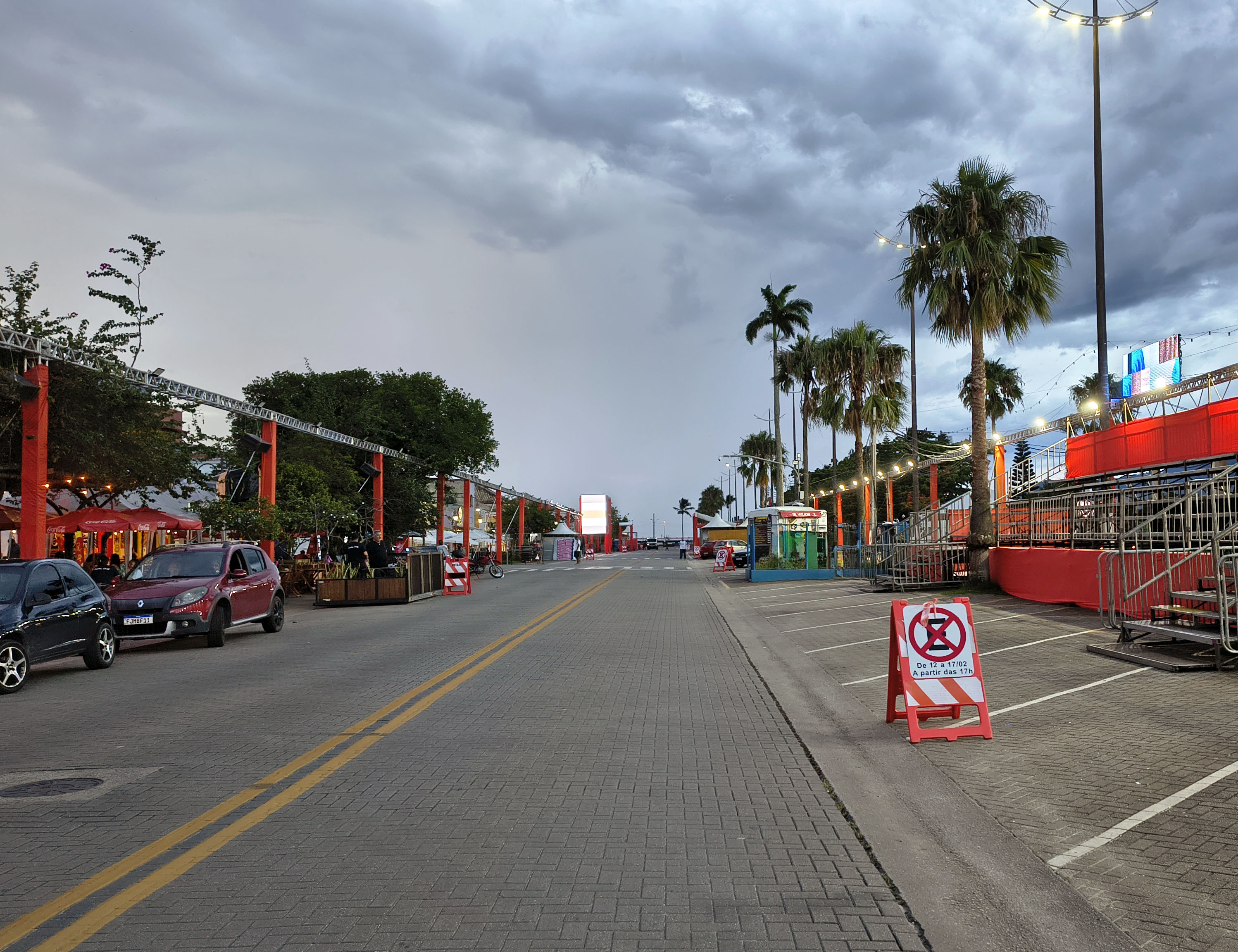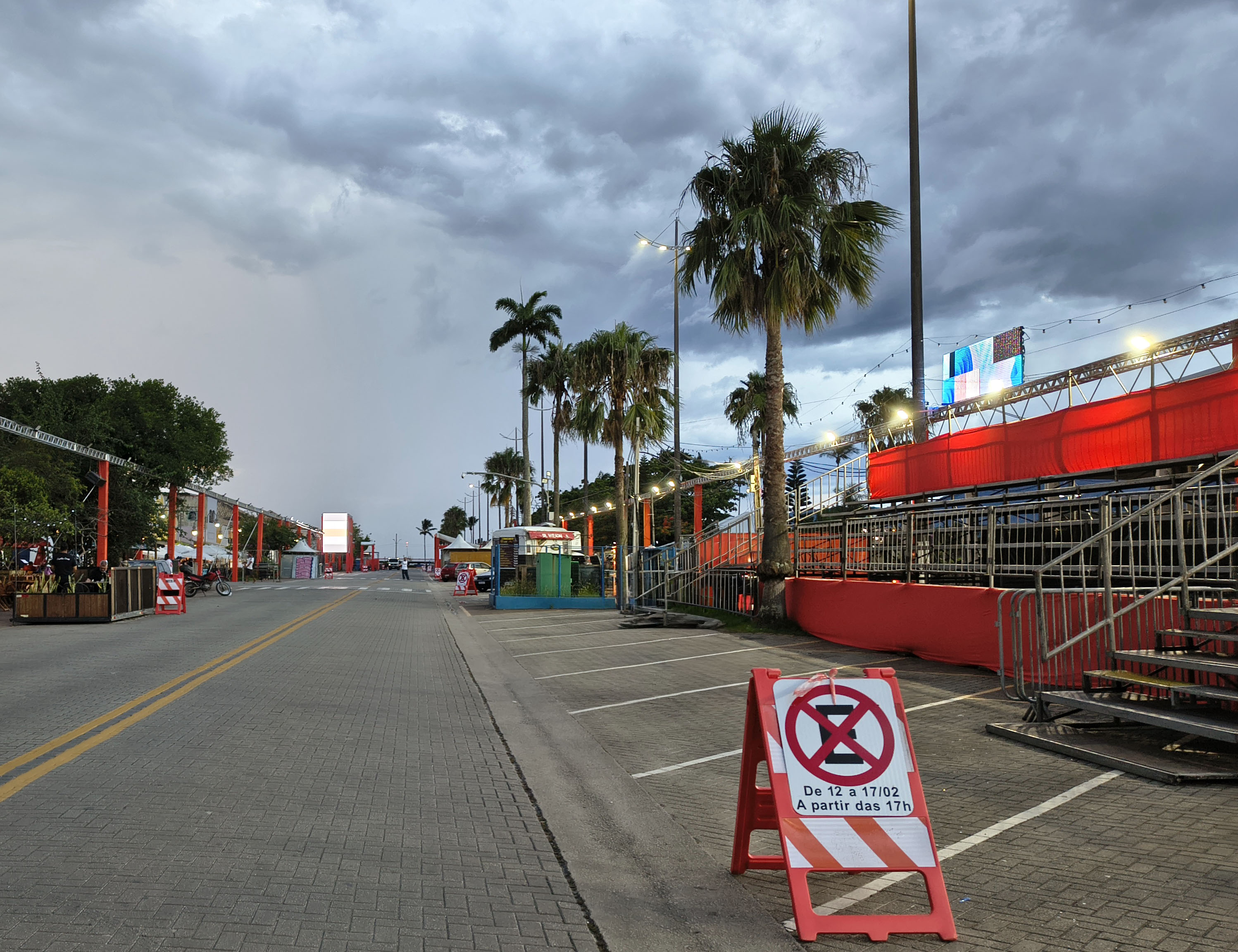 #PraTodosVerem: A imagem mostra uma rua de paralelepípedos cercada por estruturas metálicas vermelhas e arquibancadas preparadas para um evento ao ar livre, sob um céu nublado de fim de tarde. Em primeiro plano, um cavalete plástico vermelho exibe uma placa de "proibido estacionar" com o aviso "De 12 a 17/02 A partir das 17h". Ao longo da via, veem-se palmeiras, carros estacionados à esquerda e iluminação festiva suspensa, criando um corredor para o evento. Fim da descrição.