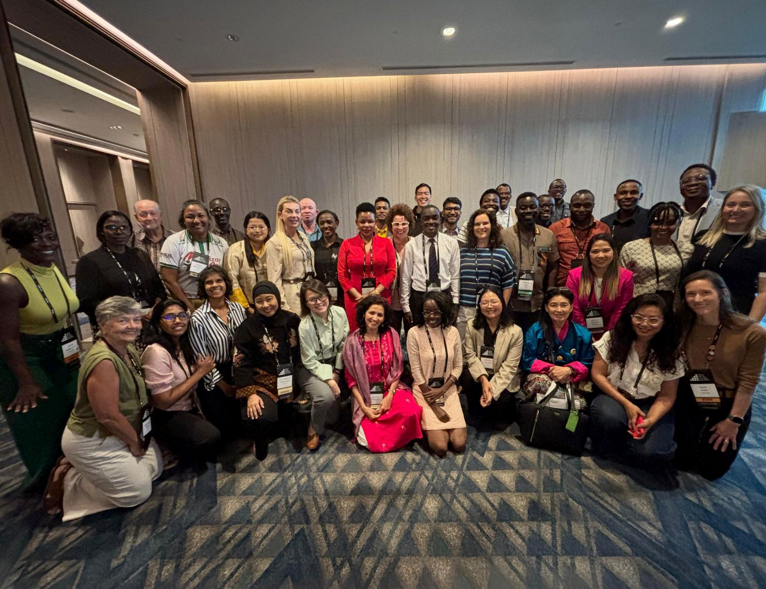 #PraTodosVerem: Na primeira imagem, é possível ver homens e mulheres, líderes de Políticas Públicas para a Primeiríssima Infância de diversos países, reunidos, pousando para foto durante o Fórum Mundial sobre Educação e Cuidados na Primeira Infância, em Kuala Lumpur, na Malásia. Na segunda imagem, uma mulher, de pele branca e loira, atrás de um púlpito, discursa durante o evento.