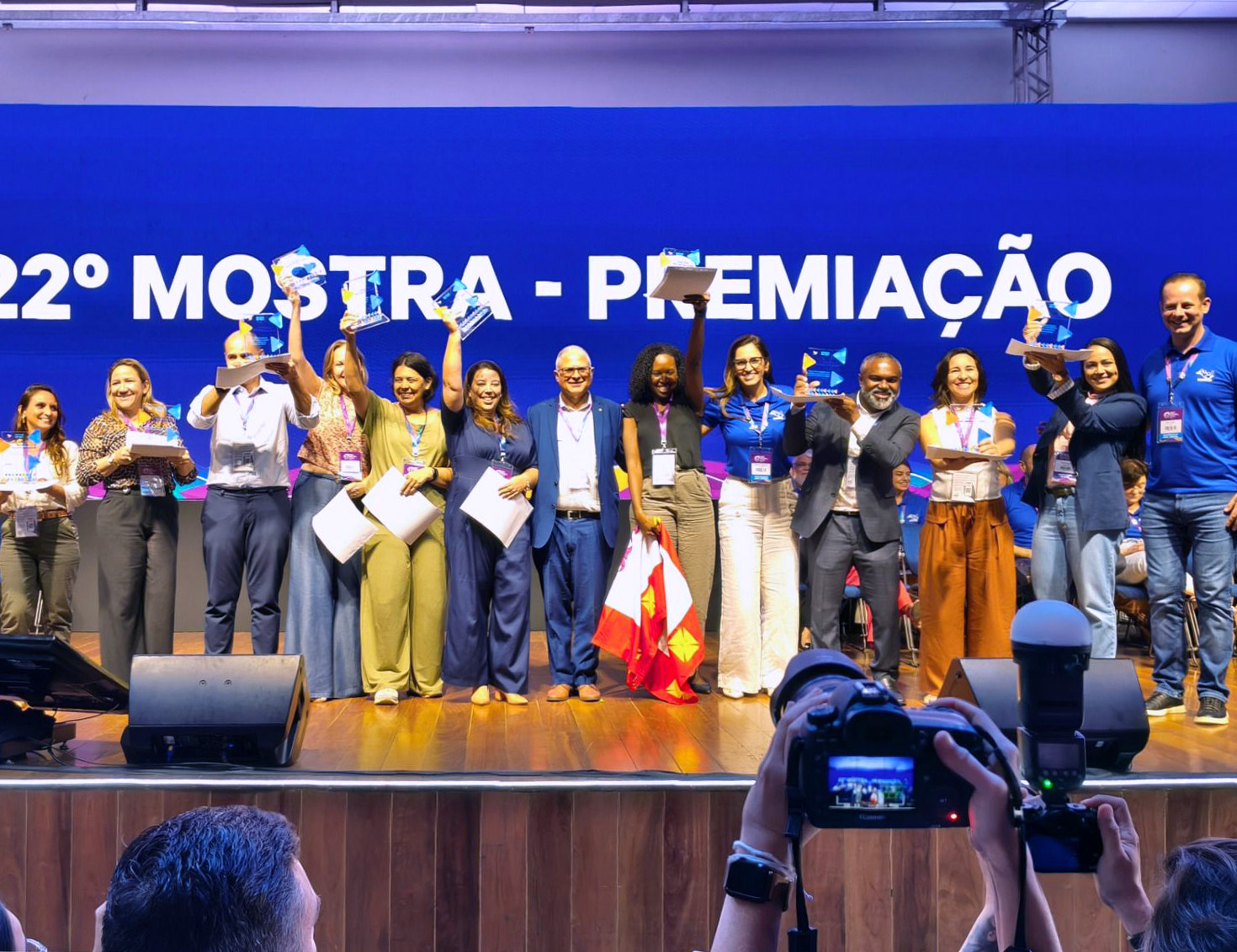 #PraTodosVerem: Conjunto de quatro fotografias registra a comitiva de São Sebastião no 39º Congresso de Secretários Municipais de Saúde em Santos, abril de 2026. As imagens mostram o grupo reunido em frente a painéis do evento e celebrando no palco a conquista do prêmio na "22ª Mostra de Experiências Exitosas". Em destaque, representantes seguram um troféu de acrílico transparente com detalhes em azul e laranja, celebrando o reconhecimento de práticas integrativas de saúde em um ambiente de alegria e integração profissional. Fim da descrição.