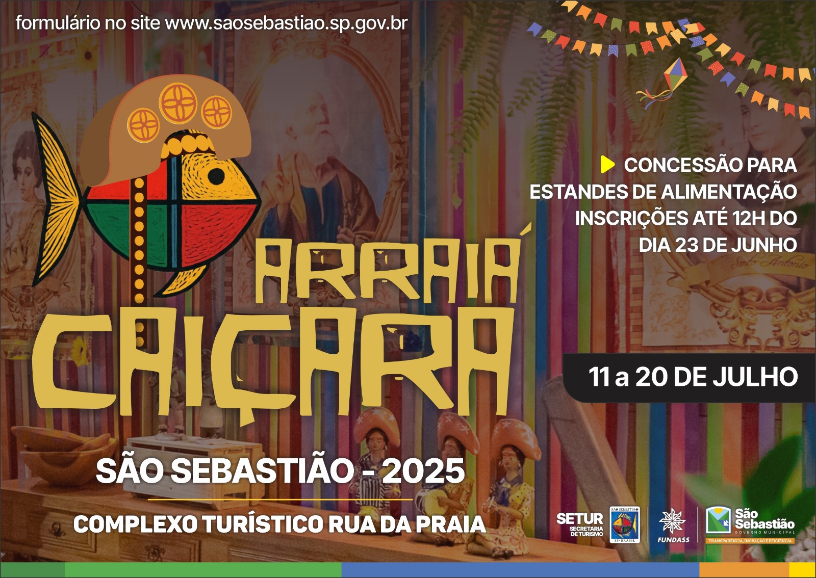 Seguem abertas as inscrições da concessão de estandes para comercialização de alimentos tradicionais durante o Arraiá Caiçara de São Sebastião 2025, que ocorrerá de 11 a 20 de julho, no Complexo Turístico da Rua da Praia, no Centro Histórico.