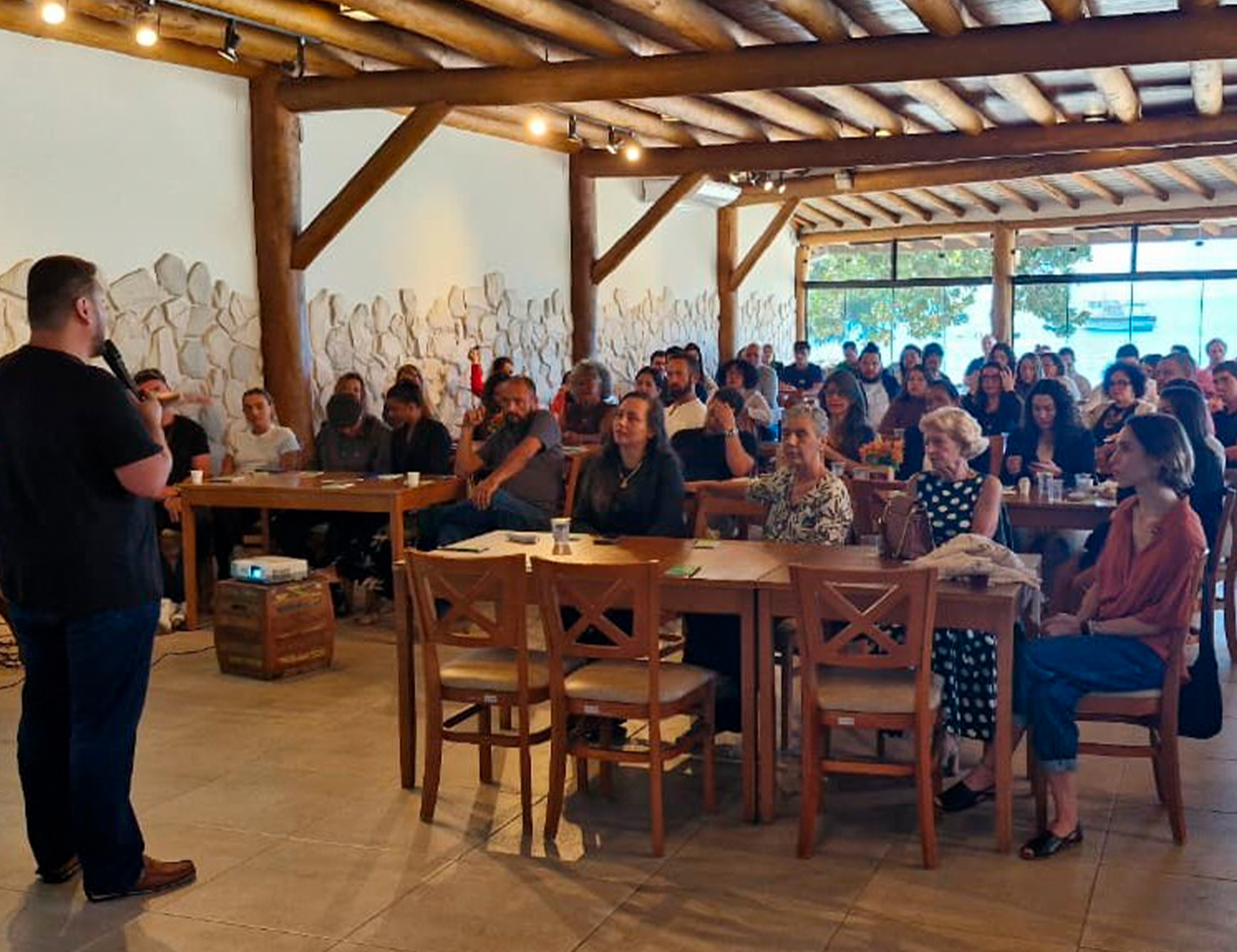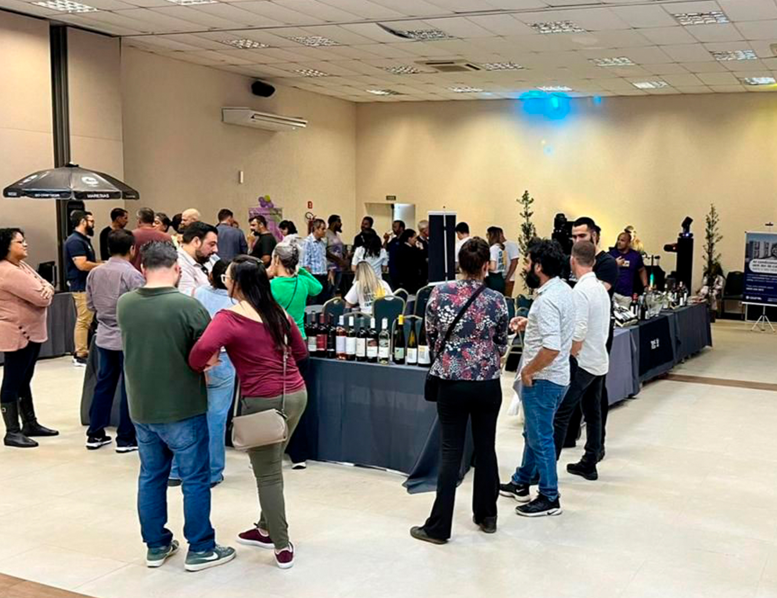 #PraTodosVerem: Em um ambiente descontraído e colaborativo, pessoas participam de palestras e momentos de networking, reunindo-se em mesas para acompanhar apresentações e trocar experiências na última edição do Feirão de Negócios de Maresias e Café Empresarial. Em outro espaço, visitantes circulam entre estandes com exposição de bebidas e produtos, conversando em pequenos grupos e fortalecendo conexões, em um clima de interação e troca de ideias. Fim da descrição.