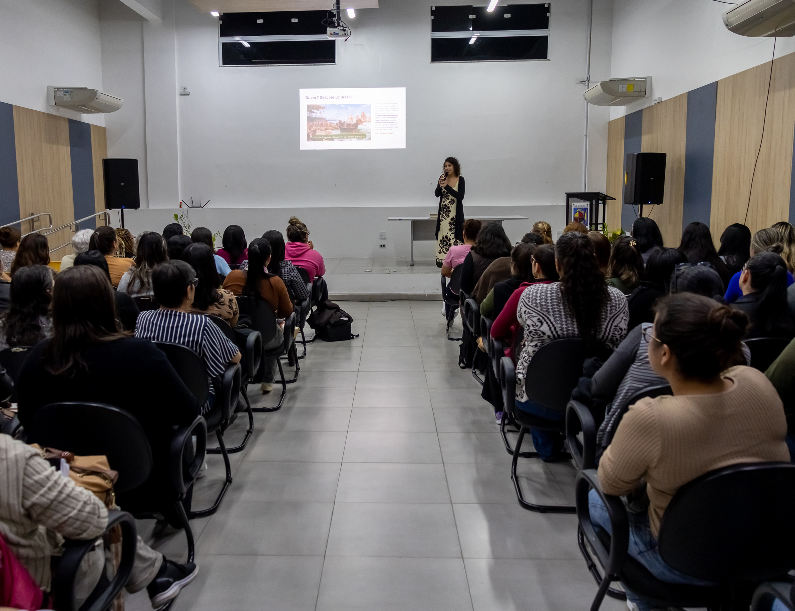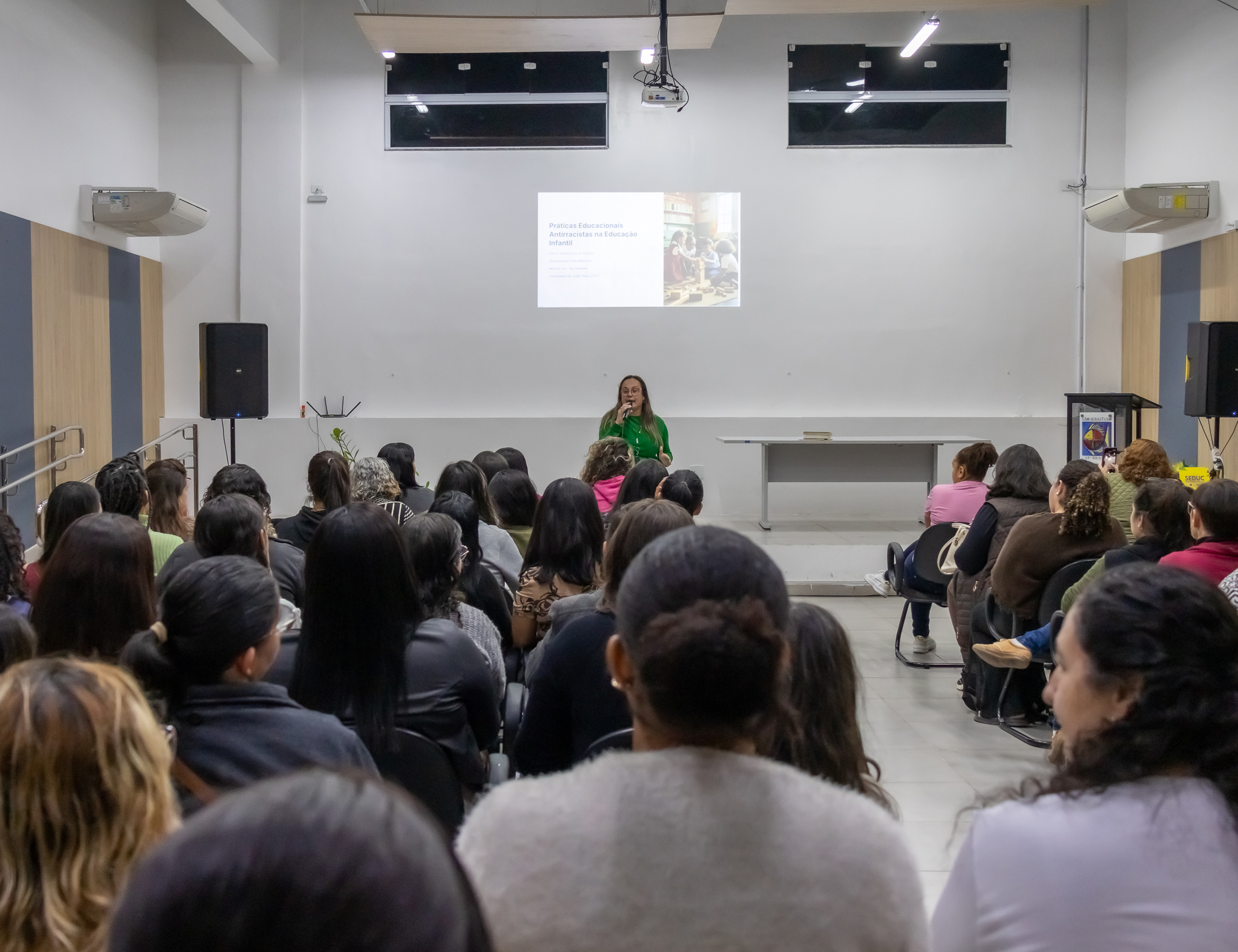 Citando autores como Chimamanda Ngozi Adichie, Walter Benjamin, Grada Kilomba e Ailton Krenak, a professora evidenciou como estereótipos e apagamentos culturais afetam diretamente a autoestima e o desenvolvimento das crianças.