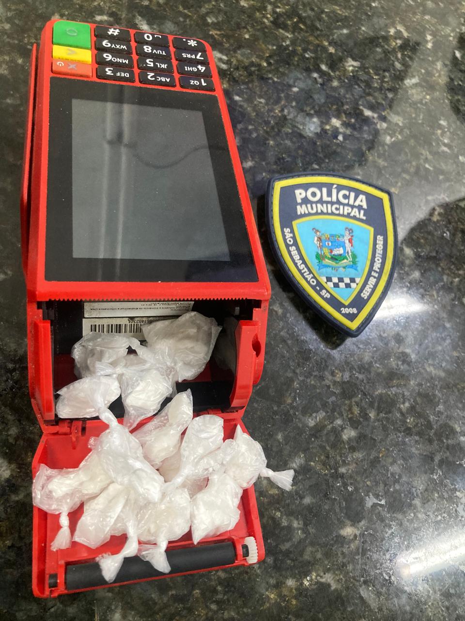 #PraTodosVerem: Nas imagens, é possível ver o momento da abordagem realizada pela Polícia Municipal de São Sebastião em Boiçucanga. O registro mostra a viatura estacionada na via, com os agentes desembarcando para realizar a ação e abordar o suspeito nas proximidades de um muro azul. Em outra imagem, o homem aparece caminhando em frente a uma banca de jornal onde o entorpecente foi localizado. Também há a foto do material apreendido: sobre uma superfície de pedra escura, uma máquina de cartão vermelha está aberta, com pequenos invólucros plásticos contendo substância branca em seu interior, ao lado do brasão da Polícia Municipal de São Sebastião.