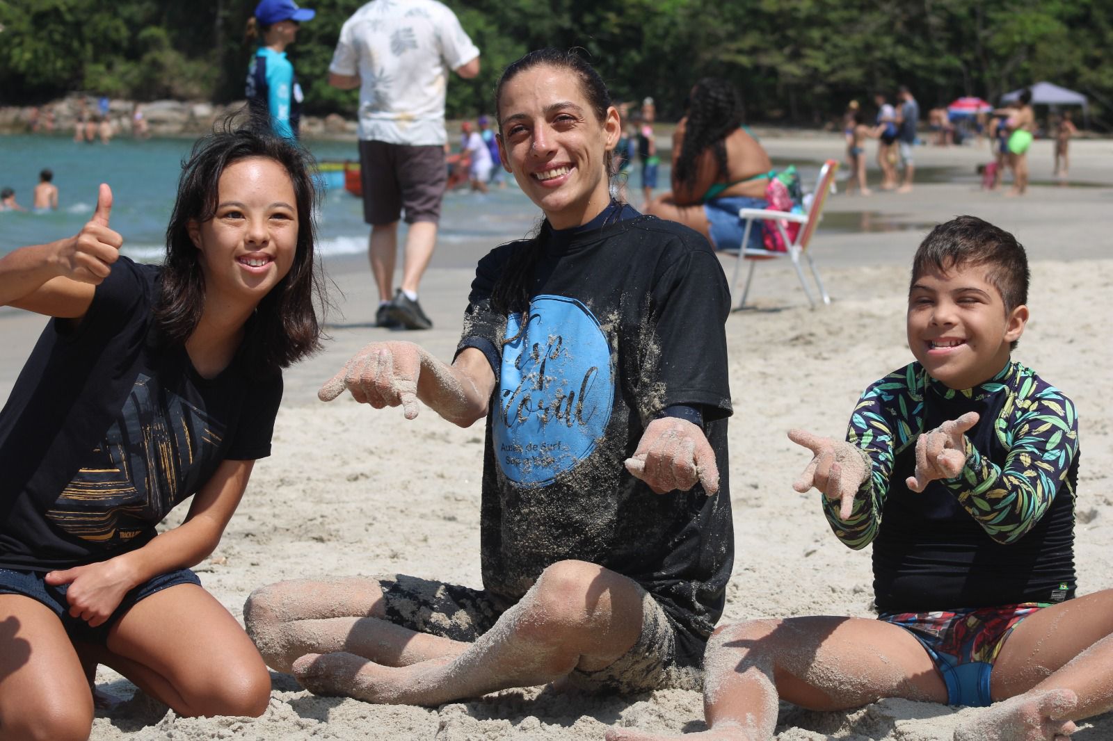#PraTodosVerem: imagens da 1ª Edição do Evento ‘Na Onda da Jade’, que promove inclusão e acessibilidade no surfe, através de aulas da modalidade esportiva para pessoas com síndrome de down e Transtorno do Espectro Autista (TEA). Fim da descrição.
