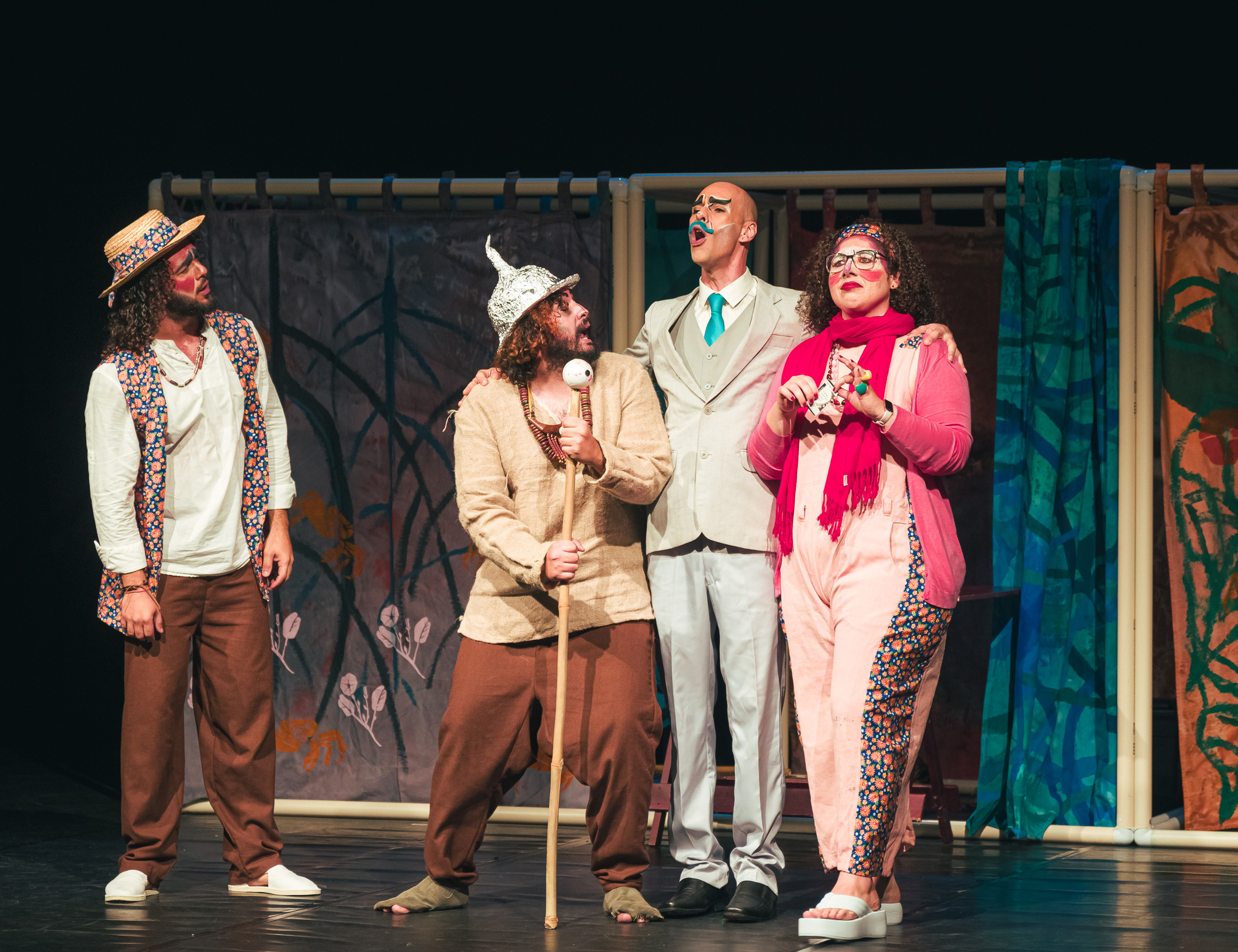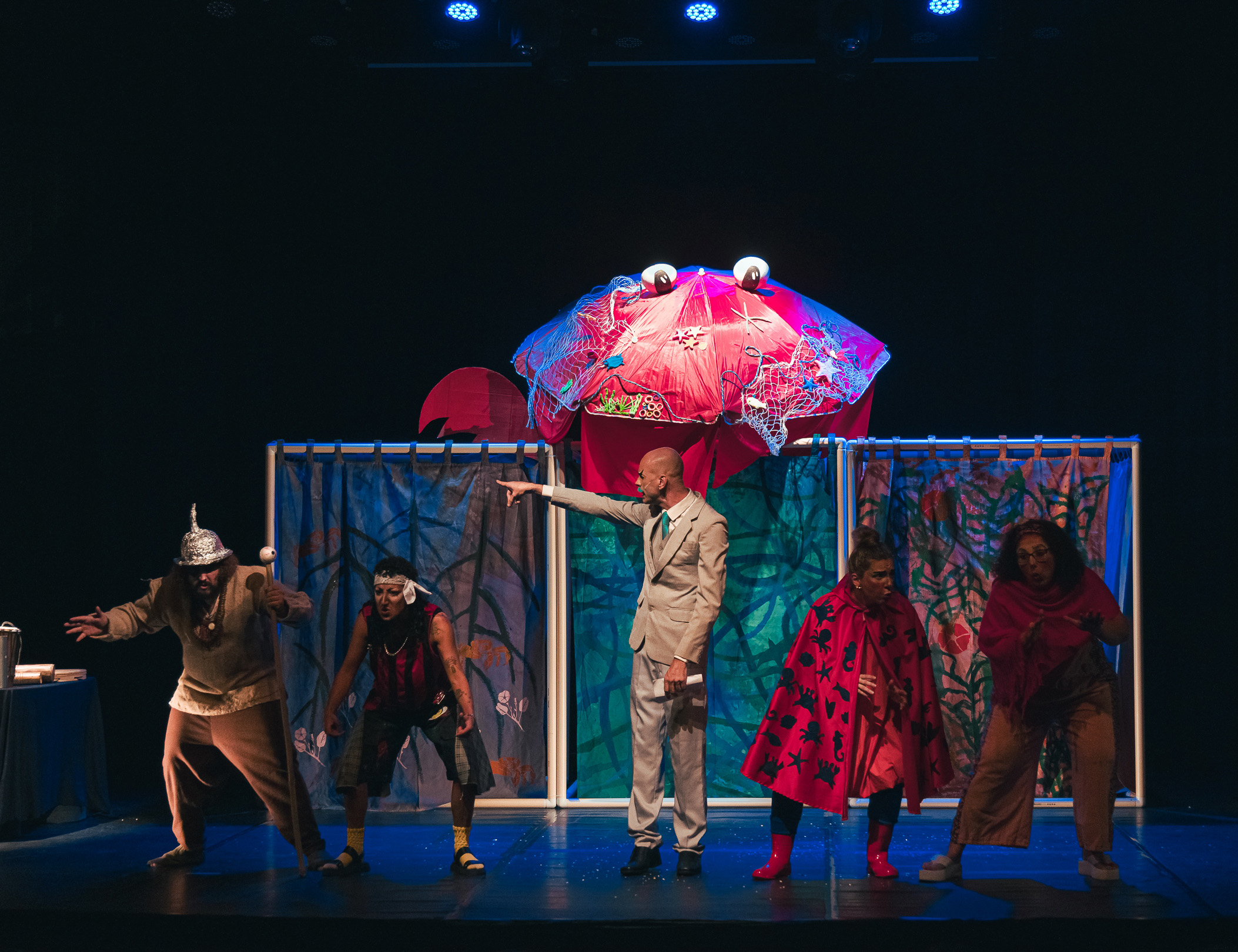 #PraTodosVerem: Cena de espetáculo teatral do Corpo Estável de Teatro de São Sebastião com cinco atores no palco, usando figurinos coloridos e expressivos. Ao fundo, há painéis pintados e um grande elemento cenográfico vermelho em formato de caranguejo. Os artistas fazem poses cômicas e interagem entre si sob iluminação de teatro. Fim da descrição.