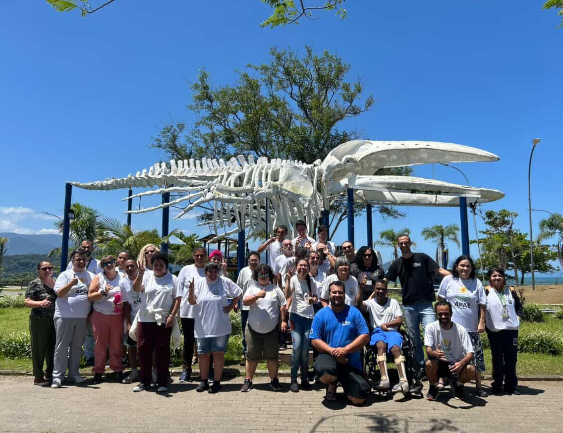 #PraTodosVerem: As imagens mostram uma excursão cultural e recreativa de um grupo da APAE, intitulada ‘Pé na Estrada’, em ambientes relacionados à vida marinha. As fotos registram o grupo, com camisetas brancas da APAE, posando em frente ao esqueleto de uma baleia em exposição e observando tanques no interior de um aquário, interagindo com as espécies marinhas, incluindo arraias e tartarugas. Fim da descrição.
