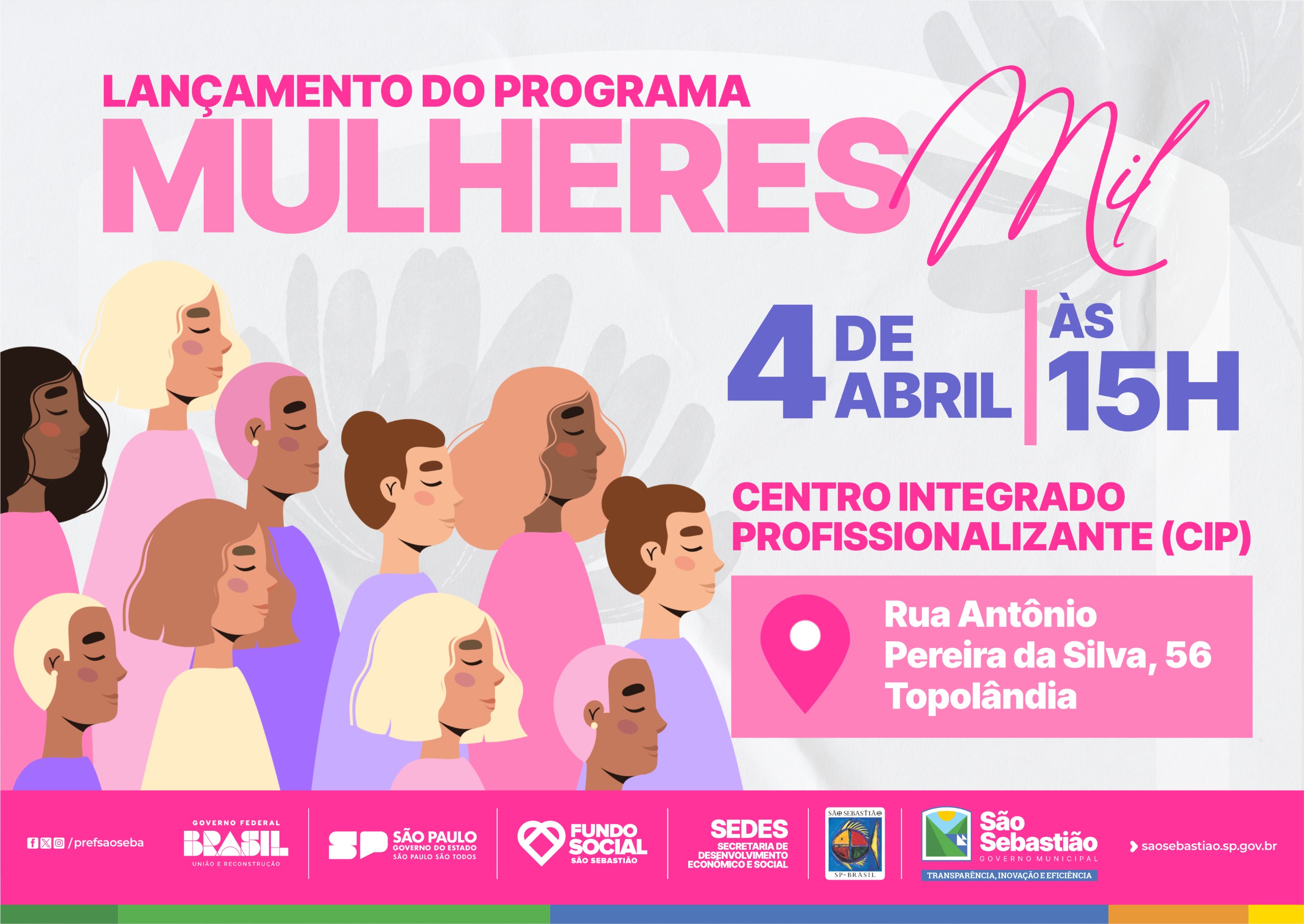A Prefeitura de São Sebastião, por meio da Secretaria de Desenvolvimento Econômico e Social (Sedes), terá evento de lançamento do programa ‘Mulheres Mil’, na sexta-feira (4/4), às 15h, no Centro Integrado Profissionalizante (CIP), localizado no bairro Topolândia.