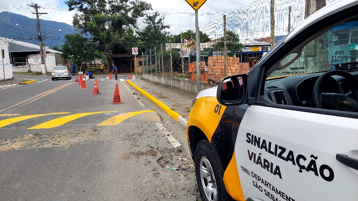 Equipes do Departamento e Trânsito da Prefeitura de São Sebastião estão reforçando a pintura e colocação da sinalização vertical e de solo em algumas ruas do bairro Jaraguá, na Costa Norte do município.