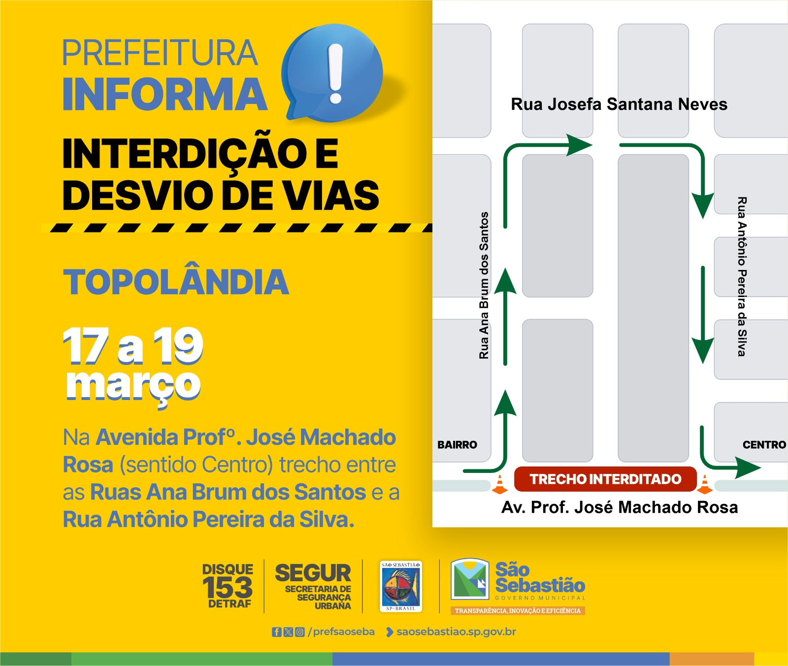 A Prefeitura de São Sebastião, por meio do Departamento de Trânsito da Secretaria de Segurança Urbana (Segur), inicia na segunda-feira (17), a interdição de parte da Avenida Professor José Machado Rosa, sentido Centro, principal via da Topolândia. No local, serão realizadas obras de melhorias entre as ruas Ana Brum dos Santos e Antônio Pereira da Silva, com previsão de se encerrarem na quarta-feira (19), por isso, motoristas e usuários devem ficar atentos aos desvios.