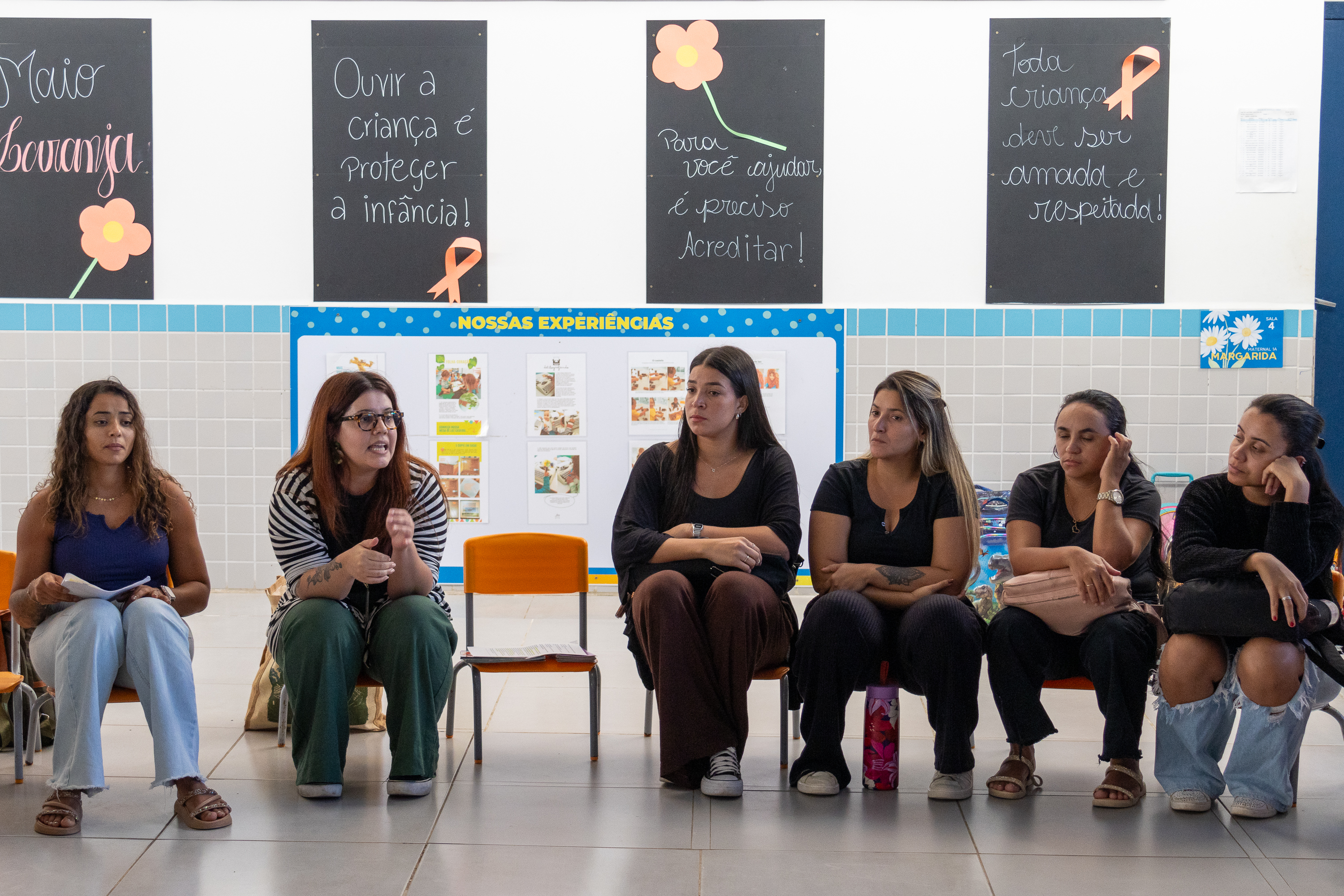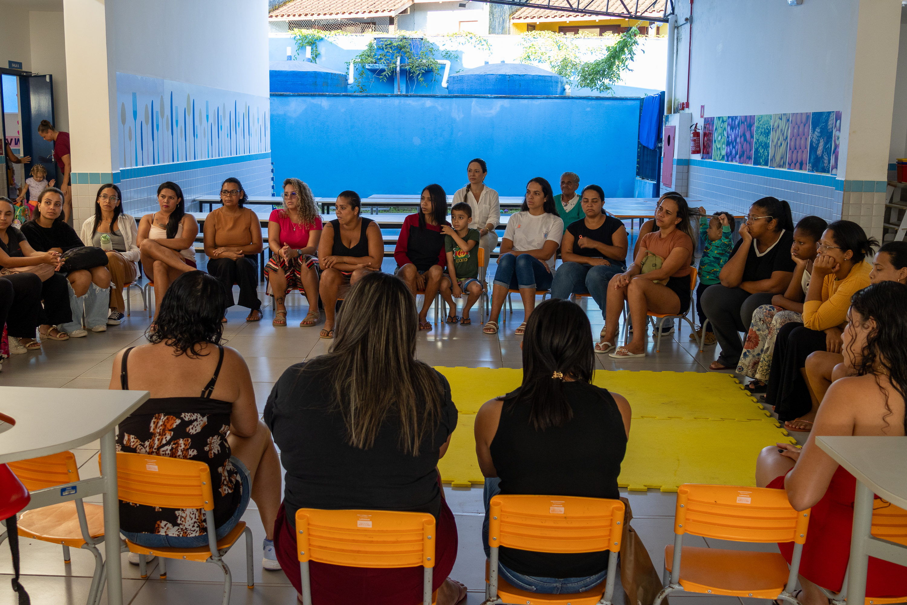 #PraTodosVerem: fotos mostram momentos da roda de conversa realizada na Creche Gabriel Almeida Teixeira Lobo, de Maresias. Fim da descrição.