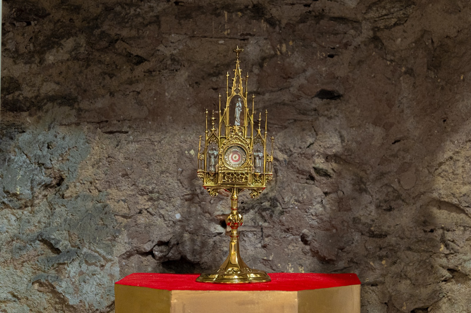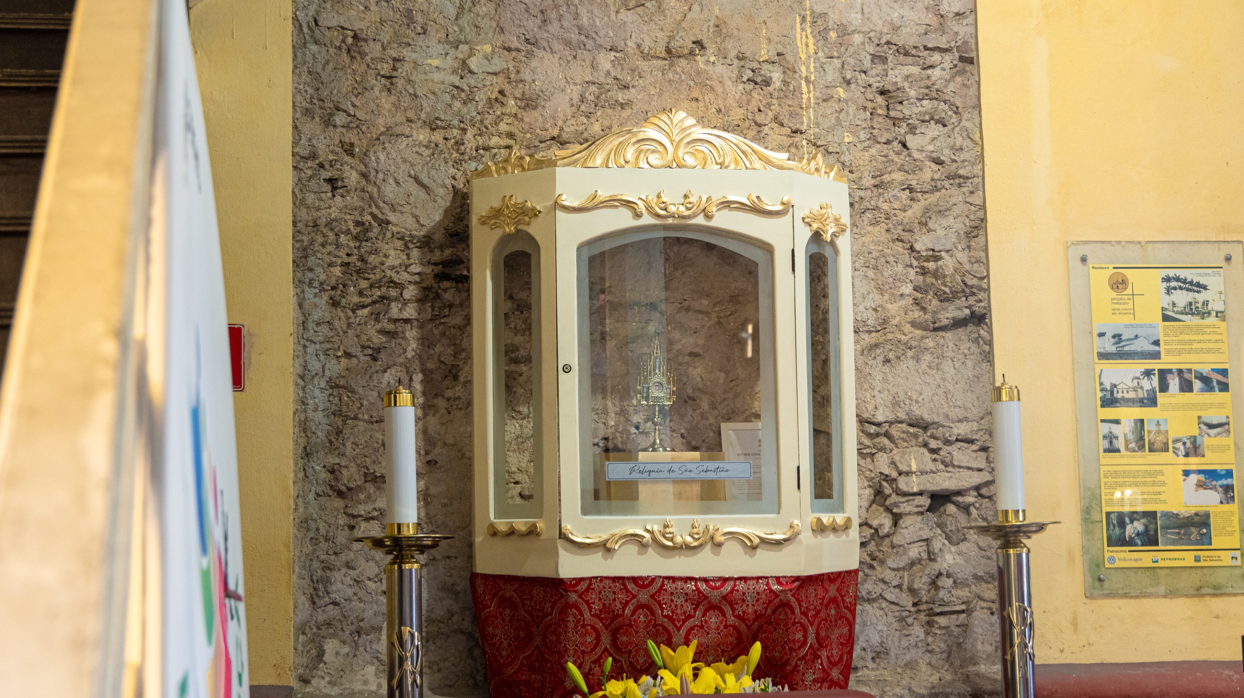 #PraTodosVerem: imagens da relíquia de primeiro grau de São Sebastião, uma parte do corpo do próprio mártir, no interior da Paróquia de São Sebastião. Fim da descrição.