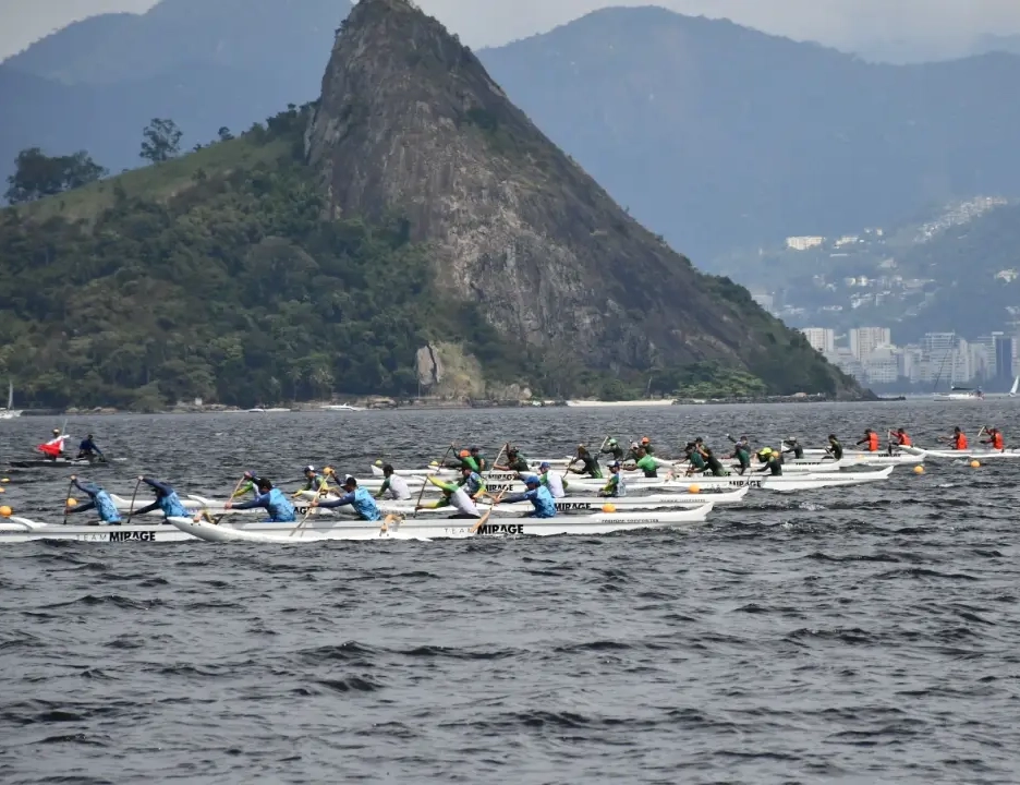 #PraTodosVerem: Remadores participam de provas de canoa havaiana em alto-mar, impulsionando as embarcações com força e sincronia, tendo como cenário montanhas, o Pão de Açúcar, o Cristo Redentor e a orla urbana ao fundo, em um dia de clima claro e mar agitado, que realça a beleza e o desafio da competição. Fim da descrição.