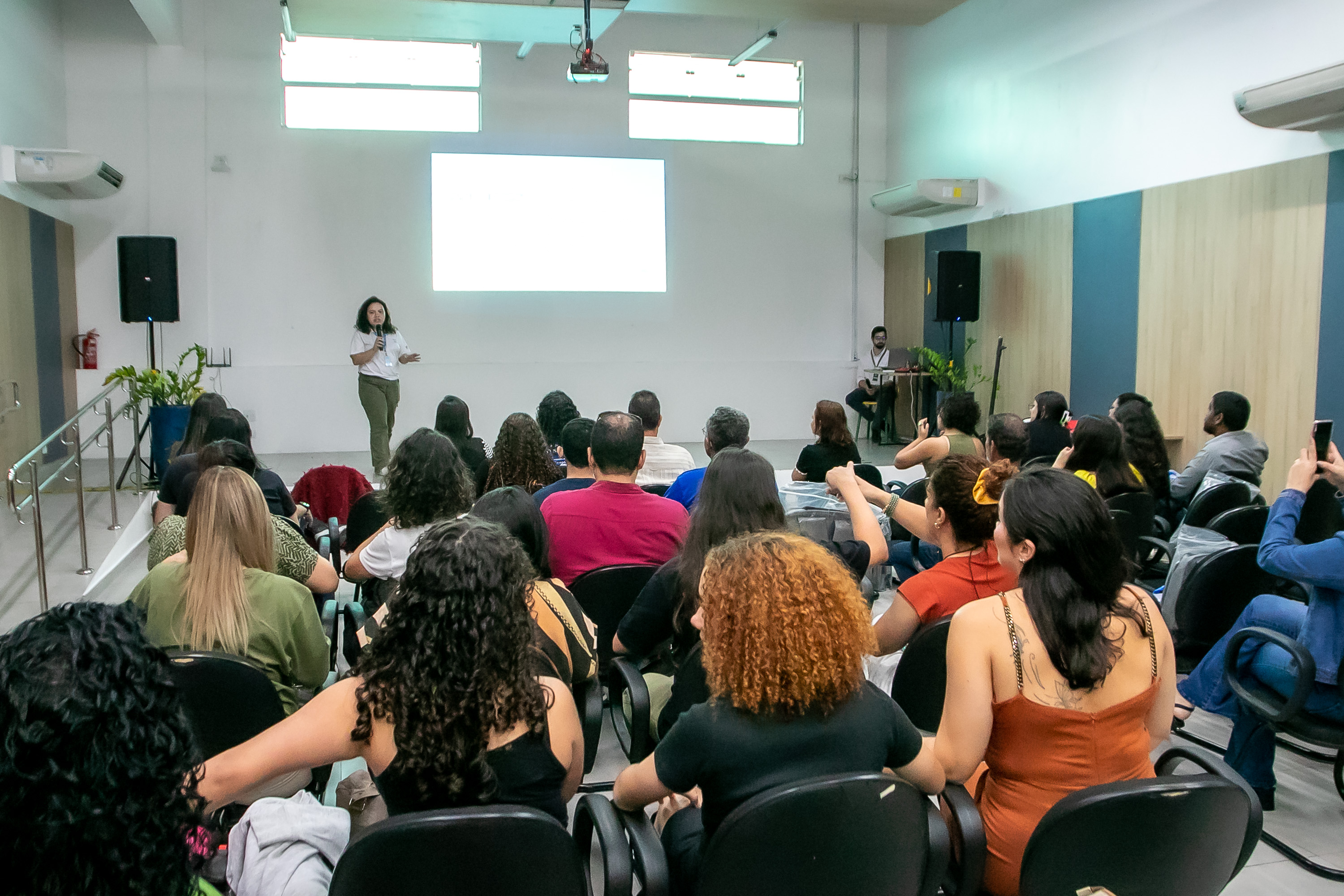 #PraTodosVerem: sequência de fotos mostra professores, alunos e seus responsáveis na reunião de alinhamento no auditório da Secretaria da Educação. Fim da descrição.