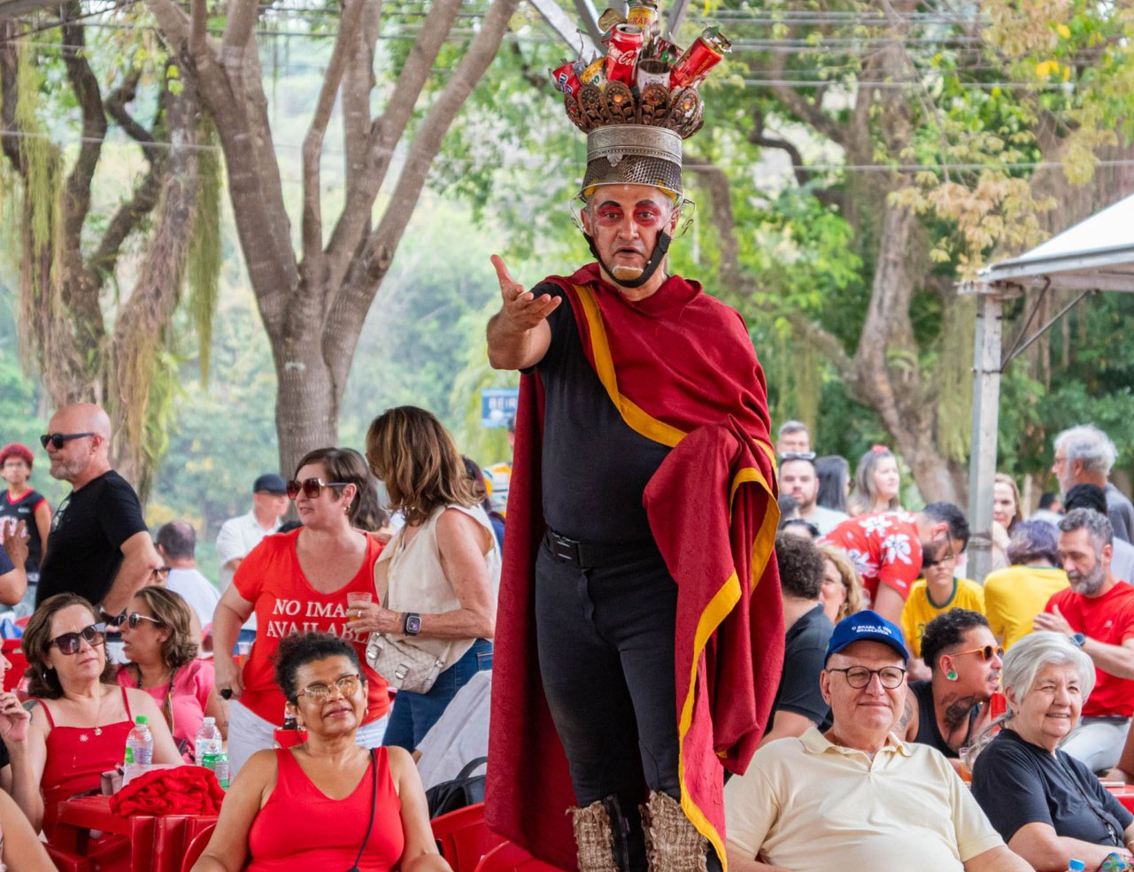 #PraTodosVerem: Imagem de um homem vestido de preto, com capa vermelha e dourada, usa uma coroa feita com latas e objetos reciclados. Ele faz um gesto com a mão enquanto se apresenta em meio a um público sentado e sorridente, em um ambiente ao ar livre com árvores ao fundo. Outra imagem com três mulheres sentadas no palco, vestindo saias longas e coloridas com estampas florais e blusas vermelhas, tocam rabecas com expressão concentrada. O fundo é escuro, destacando a iluminação quente sobre as artistas. Ao lado, há instrumentos de percussão dispostos no chão. Fim da descrição.