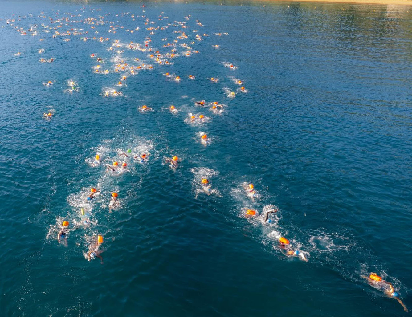 #PraTodosVerem: As imagens registram momentos marcantes da competição de natação em águas abertas ‘Travessias e Desafios Aquamundo’. Centenas de atletas, usando toucas coloridas e roupas de natação, se reúnem às margens do lago antes da largada, em meio ao público e à energia de concentração e expectativa. Em seguida, competidores aparecem cruzando a linha de chegada sob o pórtico do evento, comemorando com expressões de superação e alegria após completar o desafio em meio às belas paisagens naturais da região. Fim da descrição.