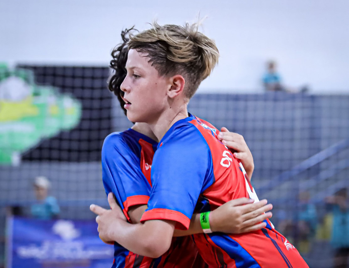 #PraTodosVerem: Nas imagens da Copa São Paulo de Futsal de Base, jovens atletas disputam intensamente a bola em quadra, com dois times em uniformes azul e amarelo-preto travando jogadas rápidas sob o olhar atento da torcida ao fundo, enquanto outra cena registra o momento de euforia após o jogo, com crianças abraçando-se próximas à grade e celebrando com familiares e colegas que vibram, sorriem e registram a comemoração, formando um ambiente de pura alegria esportiva e união. Fim da descrição.