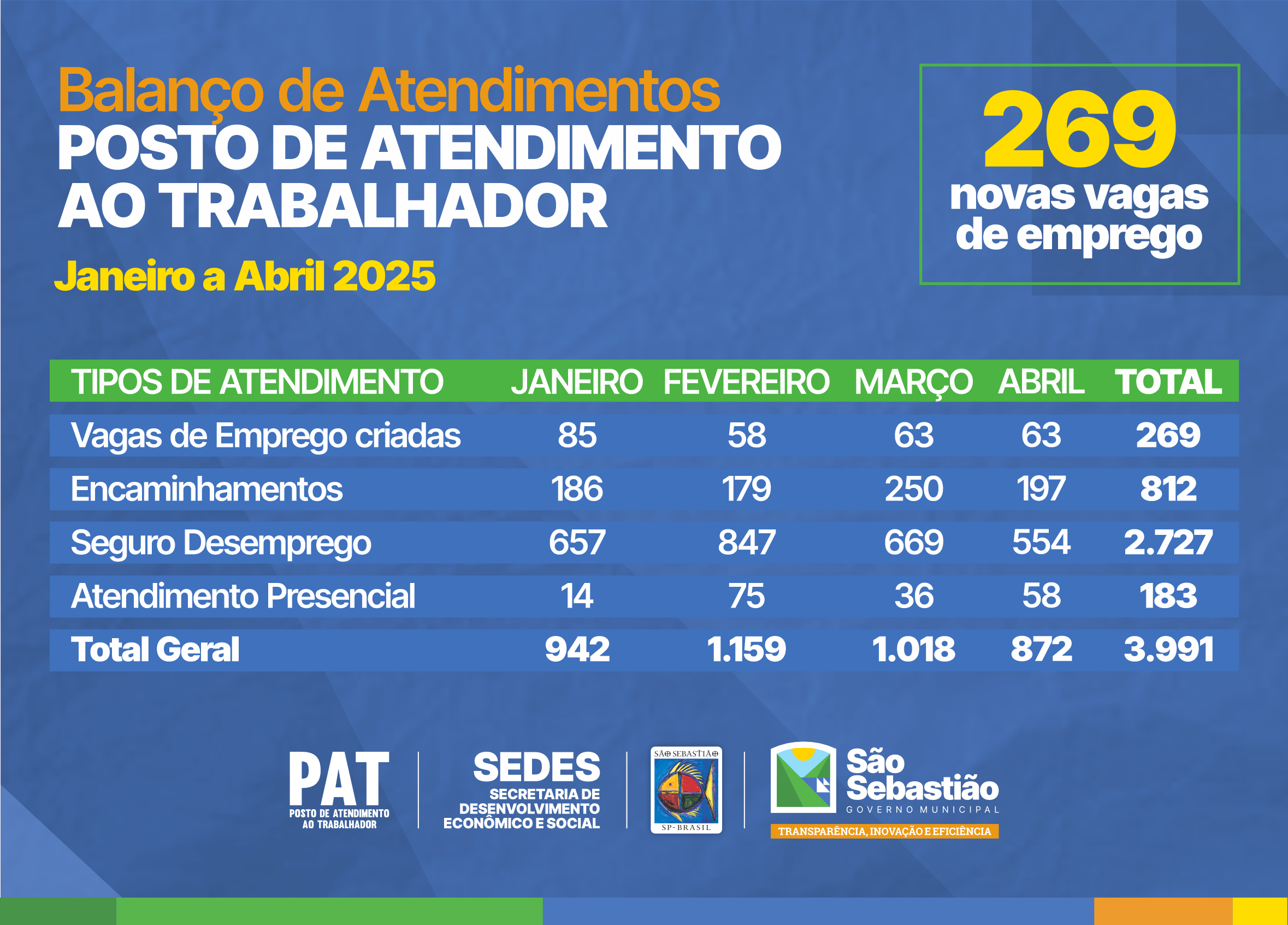Com foco na retomada econômica, empregabilidade e fortalecimento da renda das famílias sebastianenses, a Prefeitura de São Sebastião, por meio da Secretaria de Desenvolvimento Econômico e Social (Sedes), divulgou o balanço de atendimentos realizados pelo Posto de Atendimento ao Trabalhador (PAT) – Região Central, no período de janeiro a abril de 2025.