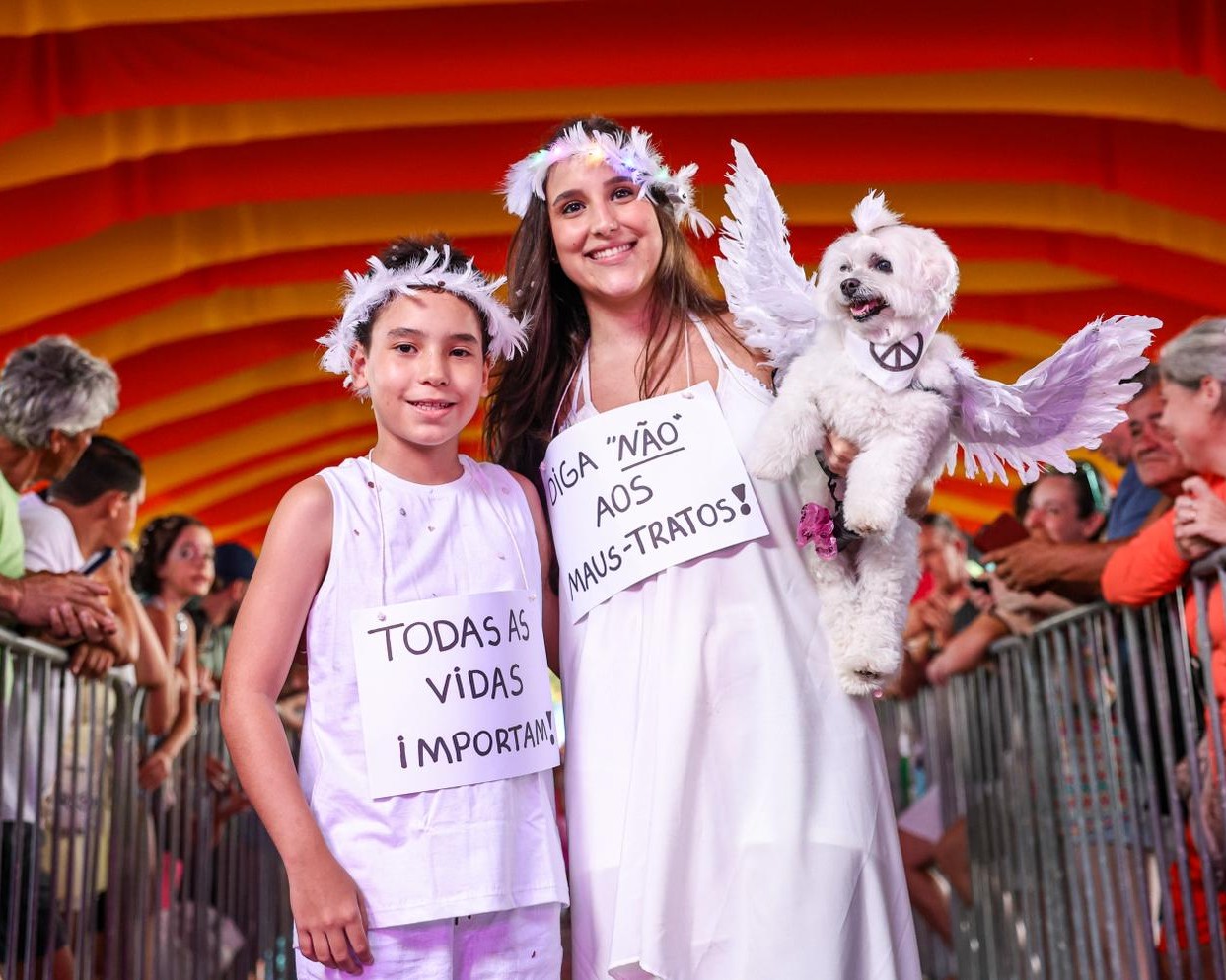 A emoção também marcou a participação de Isabela e Jonas, moradores de Santos com residência em Barequeçaba, tutores de Bia, uma Lulu da Pomerânia fantasiada de São Sebastião e vencedora da edição. Para o casal, a experiência representa um momento único de alegria e união familiar, reforçando a percepção dos animais como integrantes legítimos do núcleo afetivo e social.