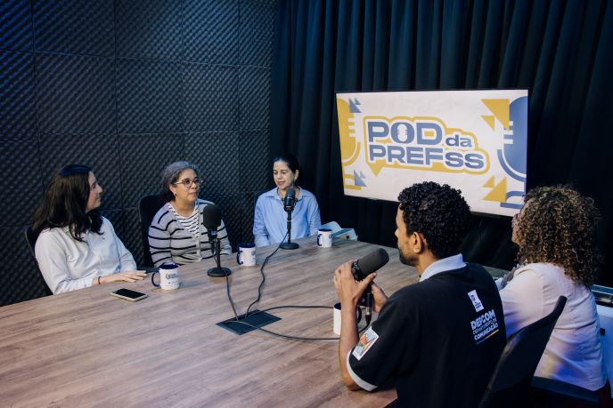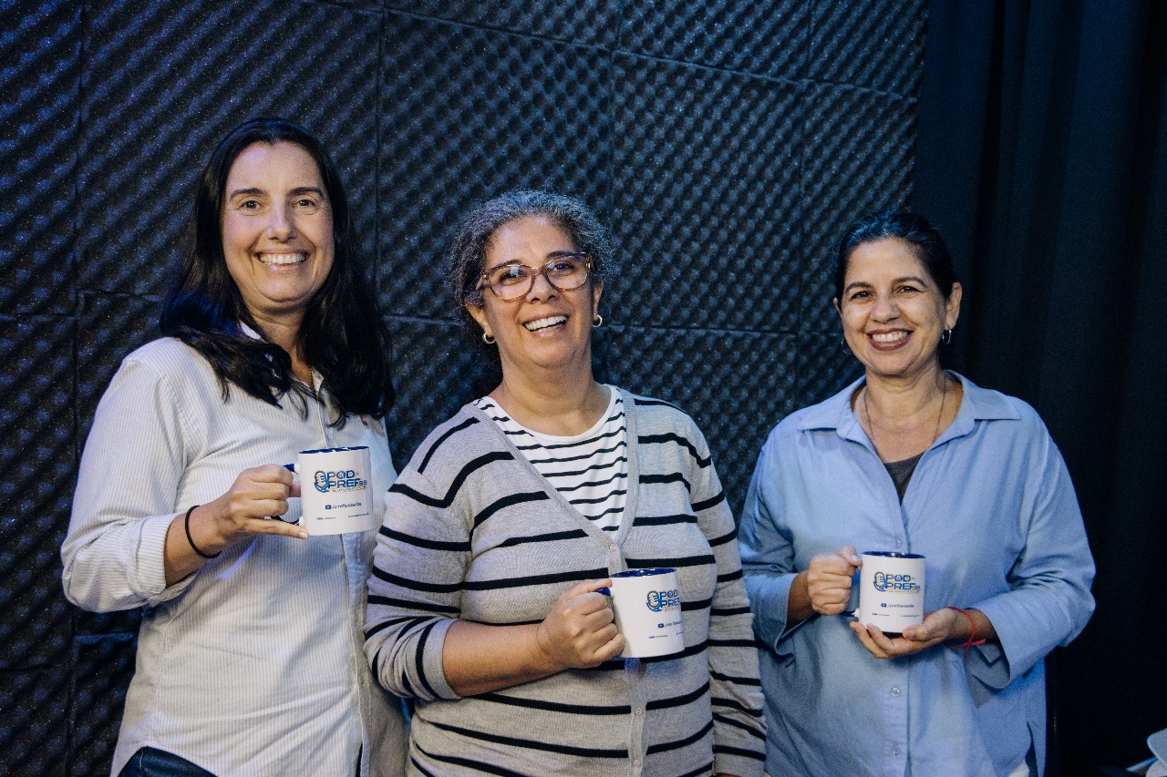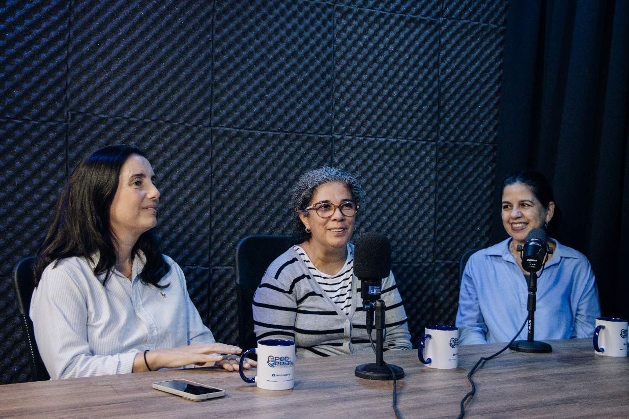 #PraTodosVerem: imagens de Fernanda Palumbo, Daniela Outi e a historiadora Cristiane da Silva durante participação do podcast oficial da Prefeitura, o Pod da PrefSS. Fim da descrição.