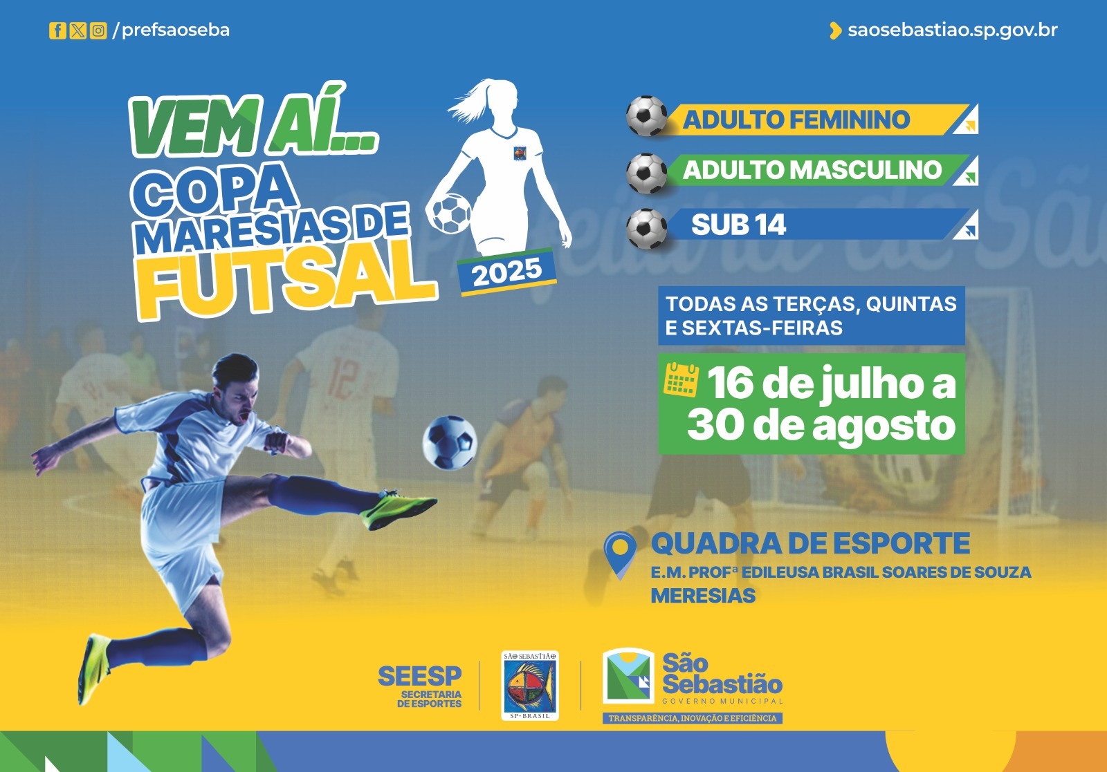 #PraTodosVerem: as imagens retratam momentos da Maresia’s Copa de Futsal 2025, com destaque para a movimentação dos atletas em quadra, a vibração da torcida e a interação entre jogadores e comissão técnica da equipe de uniforme azul e branco; também é registrada a pose firme e concentrada do time de uniforme branco com detalhes amarelos diante do painel de patrocinadores, demonstrando união e espírito competitivo; outra imagem mostra novamente o elenco azul e branco reunido antes da partida, evidenciando a preparação e o clima de equipe; outra imagem é o cartaz oficial do torneio, anunciando que a competição ocorre de 16 de julho a 30 de agosto, às terças, quintas e sextas-feiras, na quadra da Escola Edileusa, em Maresias, com disputas nas categorias adulto feminino, adulto masculino. Fim da descrição.