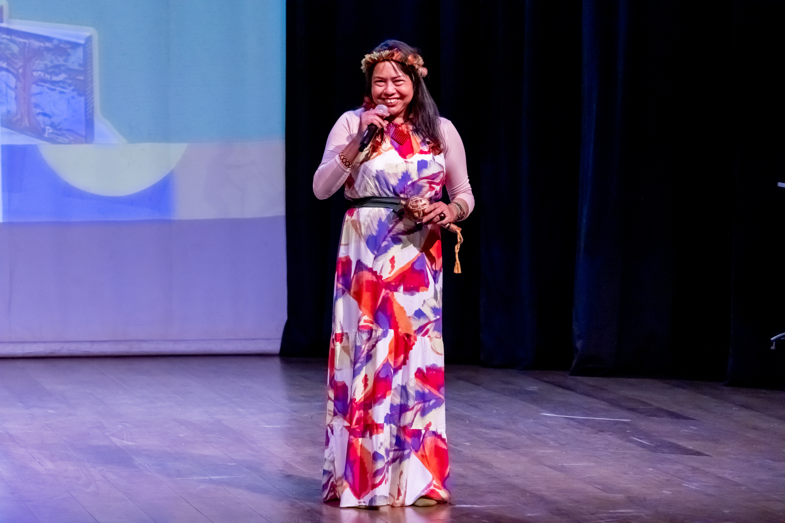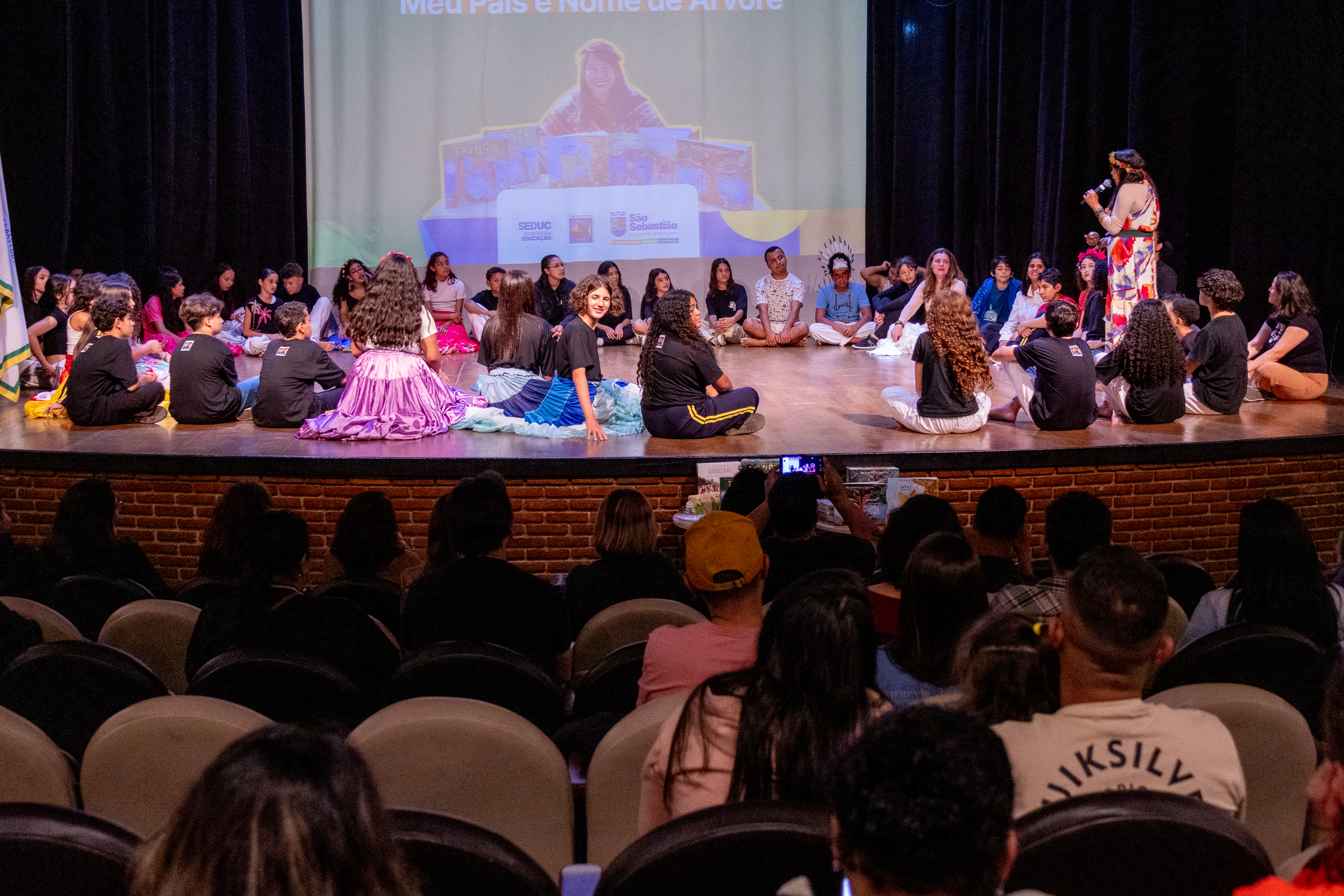 #PraTodosVerem: Na primeira imagem, em um palco de teatro, um grande grupo de crianças e adolescentes senta-se em roda, no centro, voltados para Aline Pachamama que segura um microfone e fala para eles. Ao fundo, um telão projeta imagens de livros e o título ‘Meu País e Nome de Árvore’. A plateia observa da parte inferior da imagem. Na segunda imagem, close em Aline sorrindo enquanto segura um microfone e um instrumento artesanal. Ela usa um vestido longo estampado com cores vivas em tons de vermelho, roxo e laranja, além de adornos tradicionais na cabeça e nos braços. O fundo é o mesmo palco, com cortinas pretas. Na terceira imagem, público sentado nas cadeiras do teatro assiste atentamente ao que acontece no palco. Por fim, fotos mostra estudantes durante apresentação da peça teatral. Meninas usam saiam coloridas e rodadas e giram em torno de si próprias, fazendo movimentos com as saias. Fim da descrição.
