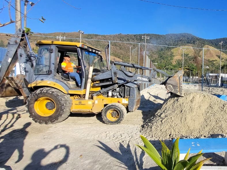 #PraTodosVerem: fotos mostram funcionários e maquinários da Prefeitura de São Sebastião, efetuando os trabalhos de revitalização de espaços esportivos da Praça do Kitesurf, no bairro da Enseada, localizado na Costa Norte do município. Fim da descrição.