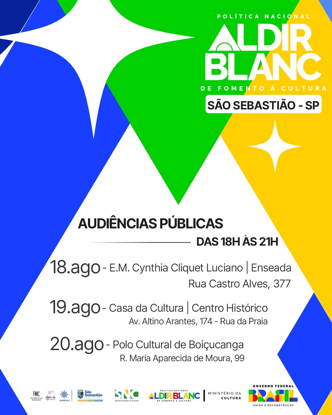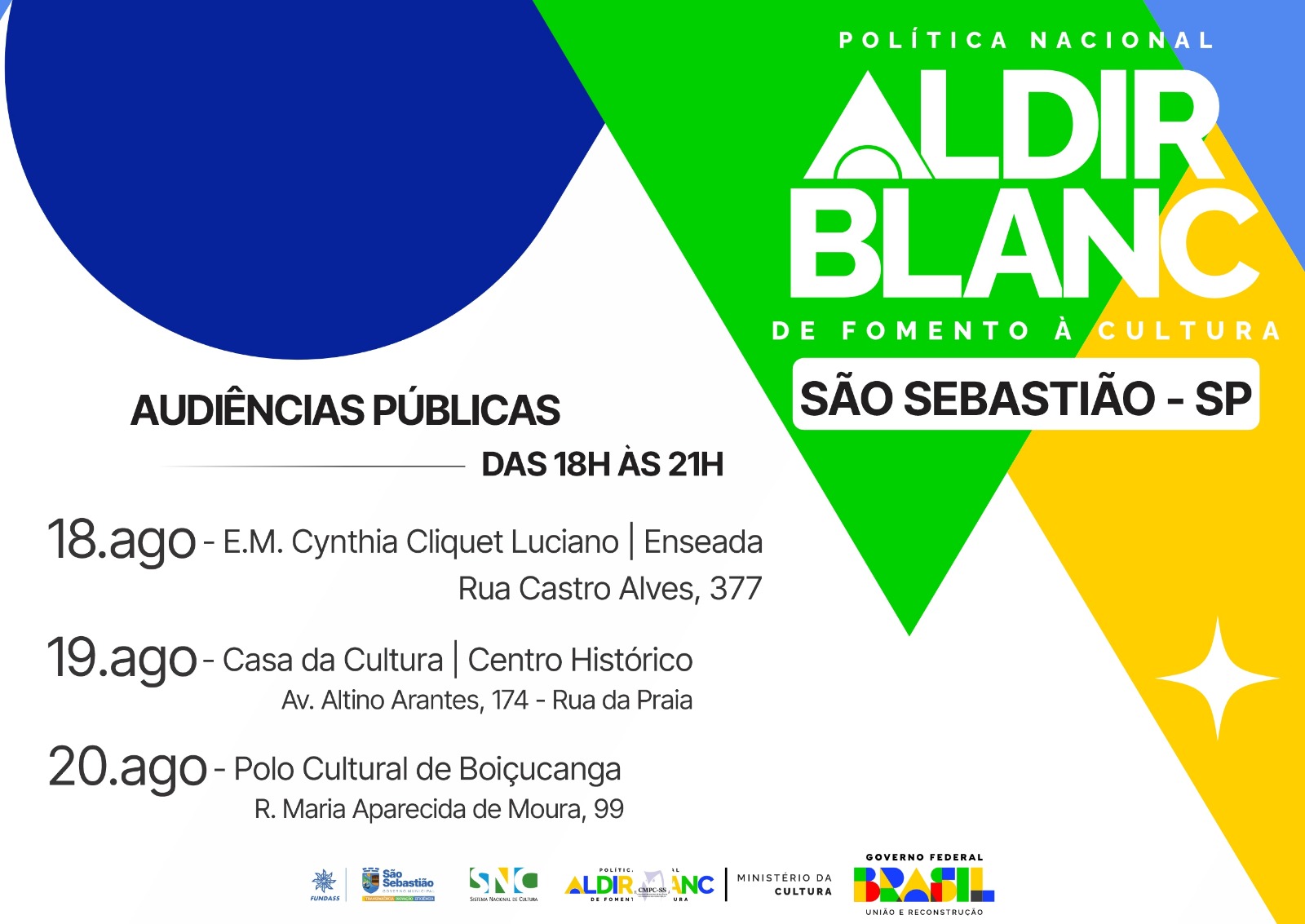 A Prefeitura de São Sebastião, por meio da Fundação Educacional e Cultural ‘Deodato Sant’Anna’ (Fundass), em parceria com o Conselho Municipal de Cultura (CMCS-SS), convida todos os artistas, produtores e fazedores de cultura do município a participarem da consulta pública sobre a aplicação dos recursos da Política Nacional Aldir Blanc de Fomento à Cultura (PNAB) – Ciclo 2.