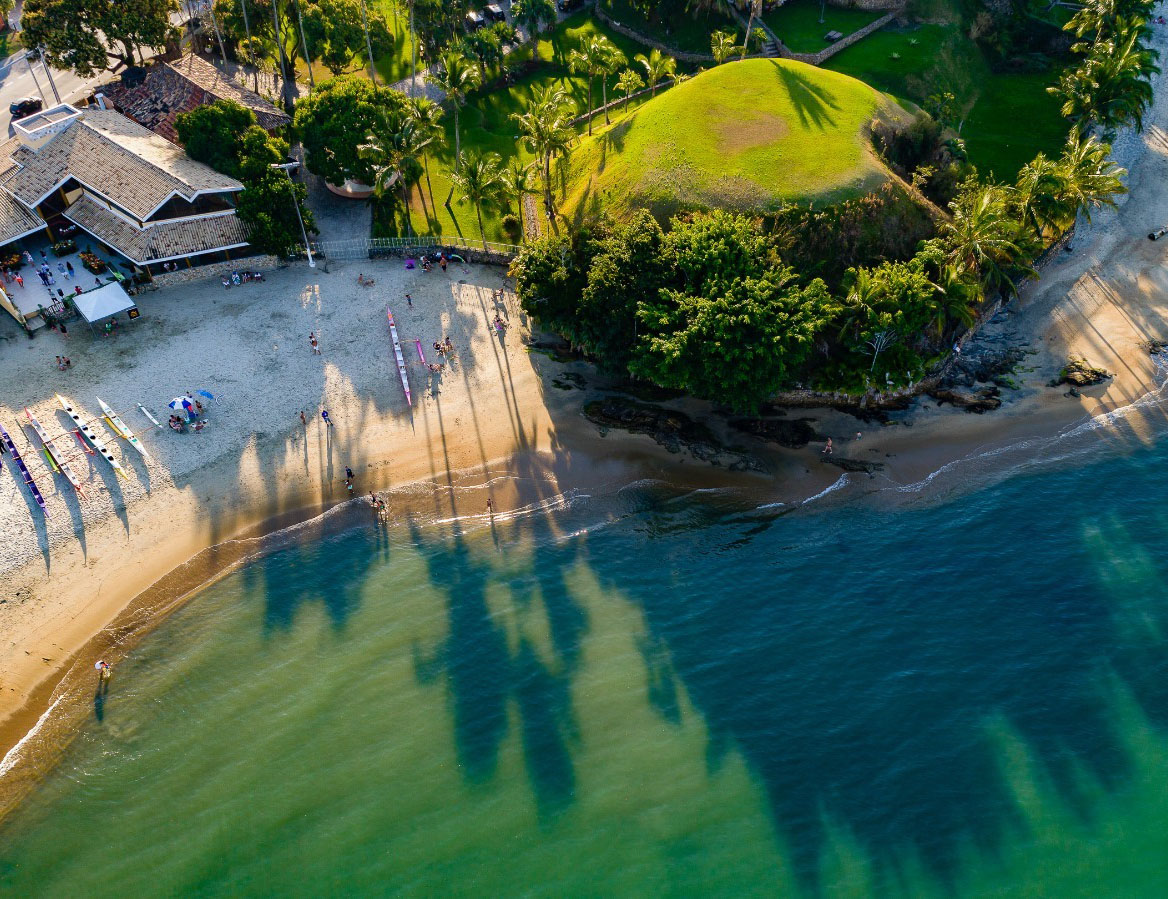 #PraTodosVerem: Foto aérea de uma praia com areia clara e mar azul-esverdeado. À esquerda, várias canoas coloridas estão alinhadas na areia, próximas a pessoas que aproveitam o dia ensolarado. No centro da imagem, um pequeno morro coberto por grama e rodeado de coqueiros se destaca, projetando sombras longas sobre a praia e o mar. À direita, a orla segue com pedras, vegetação e mais trechos de areia, enquanto as ondas tocam suavemente a costa. Fim da descrição.
