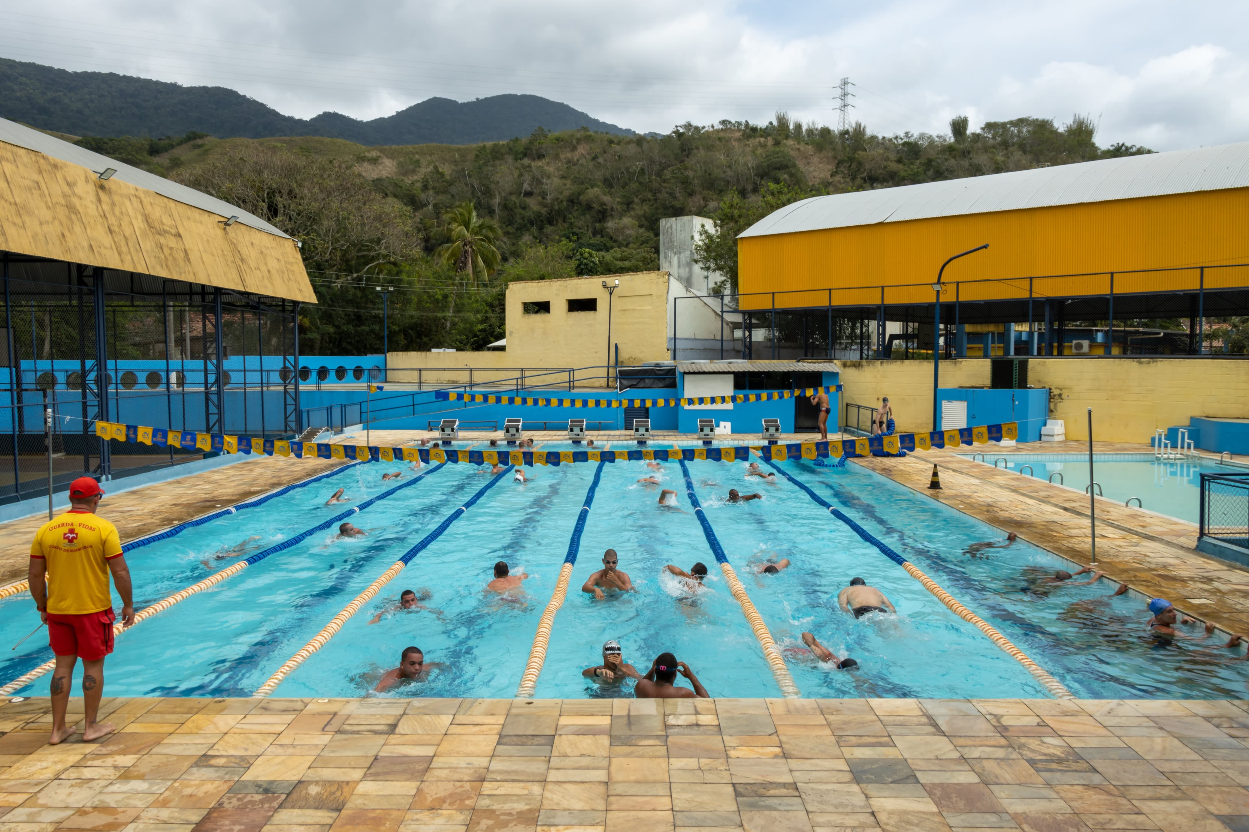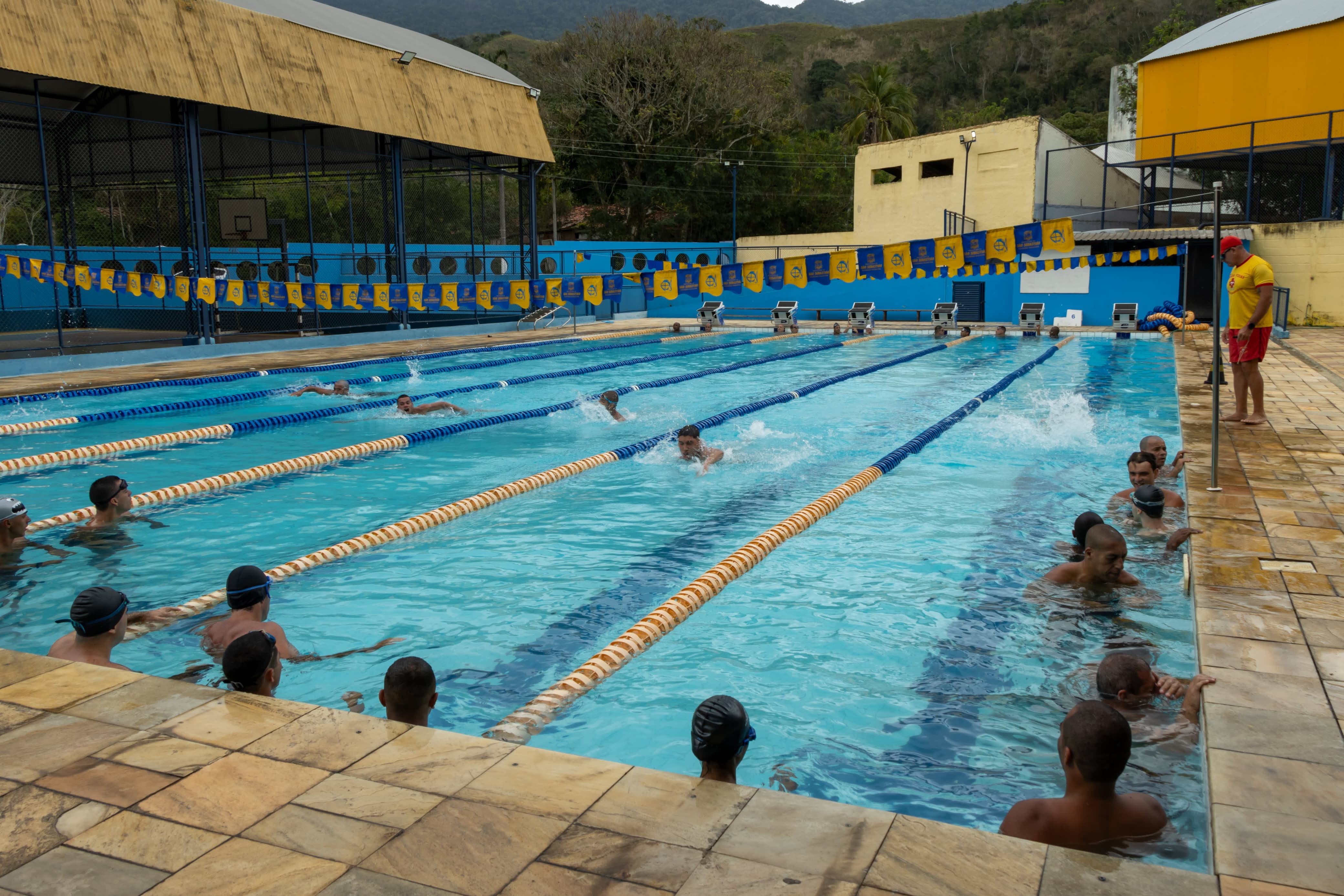 #PraTodosVerem: Sequência de imagens mostra uma piscina olímpica com várias raias, onde um grupo de homens realiza treinamento de natação sob orientação de um guarda-vidas que veste camiseta amarela e shorts vermelhos. Os participantes, em sua maioria de touca preta, estão em exercícios dentro d’água, alguns nadando estilo crawl e outros aguardando na borda. O instrutor acompanha atento os movimentos. Ao fundo, vê-se parte da estrutura coberta da piscina, bandeirolas amarelas e azuis estendidas entre as raias, além de montanhas e vegetação ao horizonte. Fim da descrição.