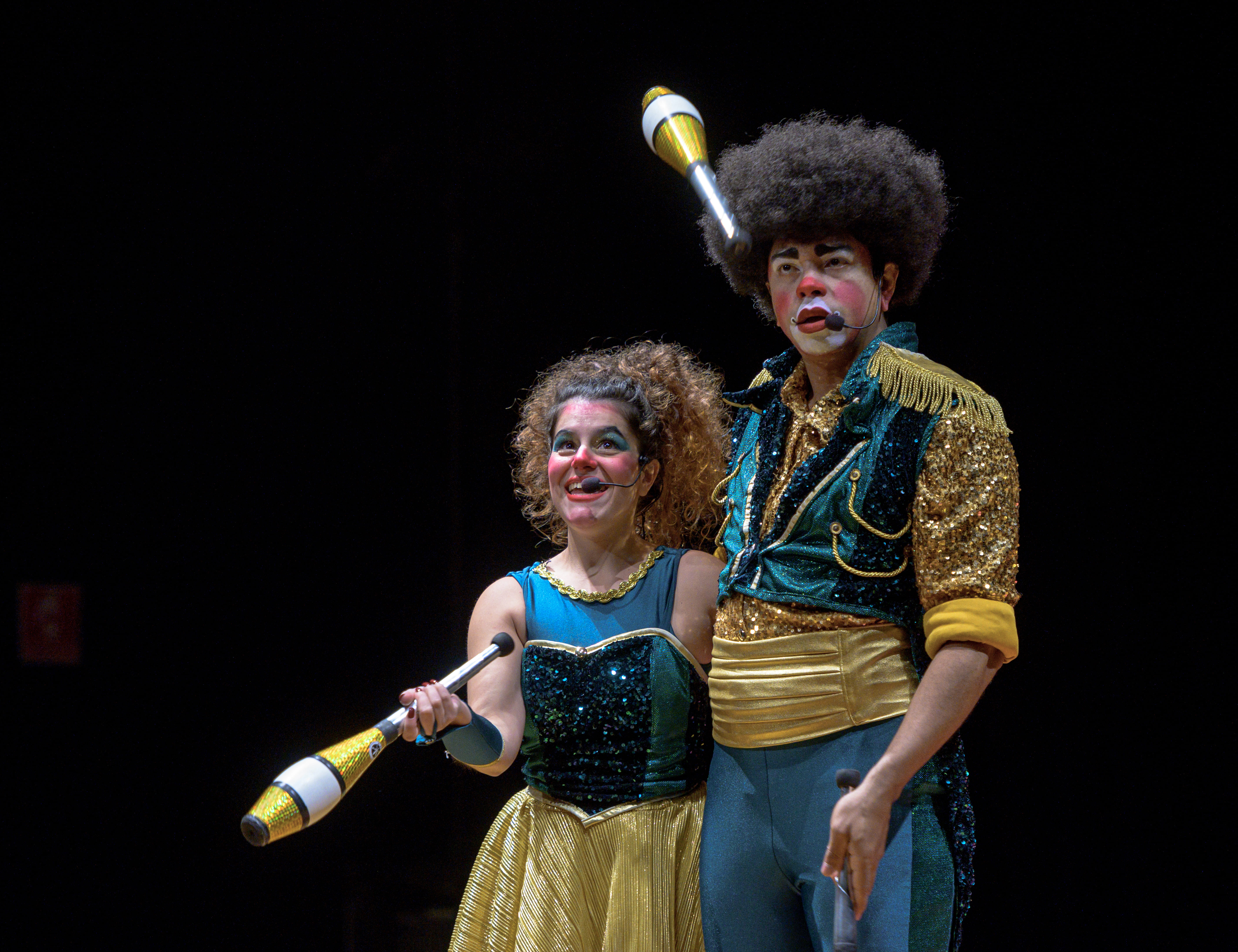 #PraTodosVerem: Sequência de imagens do espetáculo Leve Contrapeso, da Cia Circo Bem Bolado. Em cena, dois artistas de circo com figurinos brilhantes em tons de azul, verde e dourado, maquiagem cênica de palhaçaria e microfones de rosto. Eles realizam números de malabarismo com claves, acrobacias em dupla, equilíbrios e levantamentos corporais. Fim da descrição.