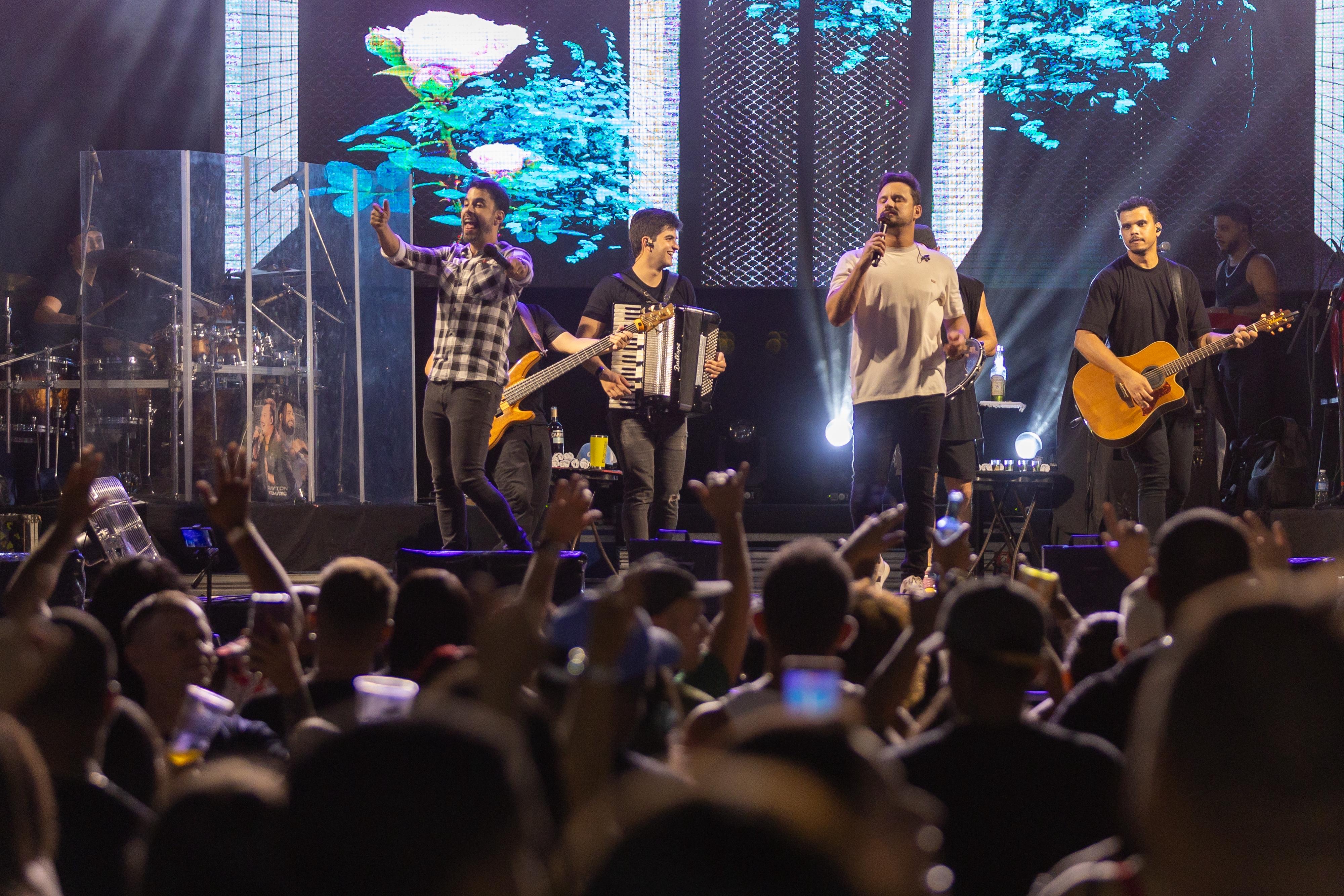 #PraTodosVerem: Imagens mostram momentos dos shows realizados no Festival Gastronômico Caiçara em São Sebastião. Em uma delas, músicos de pagode se apresentam sentados no palco tocando instrumentos de percussão. Outra foto mostra uma grande multidão acompanhando o evento em frente ao palco, com estrutura de luzes e tendas ao fundo. Também há registros da dupla sertaneja se apresentando para o público, com banda completa e iluminação de show, enquanto a plateia levanta as mãos e acompanha a apresentação. As imagens retratam a energia do público e a celebração musical durante o festival. Fim da descrição.