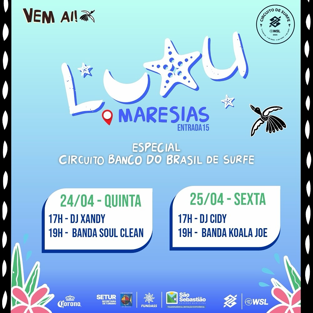 Nos dias 24 e 25 de abril, a praia de Maresias recebe o Luau Maresias, que promete reunir muita música boa à beira-mar. Aproveitando a movimentação da etapa de um dos principais campeonatos de surfe do mundo, o Qualifying Series (QS6000), que faz parte do Circuito Banco do Brasil de Surfe, o luau vai esquentar as areias com uma programação musical especial.