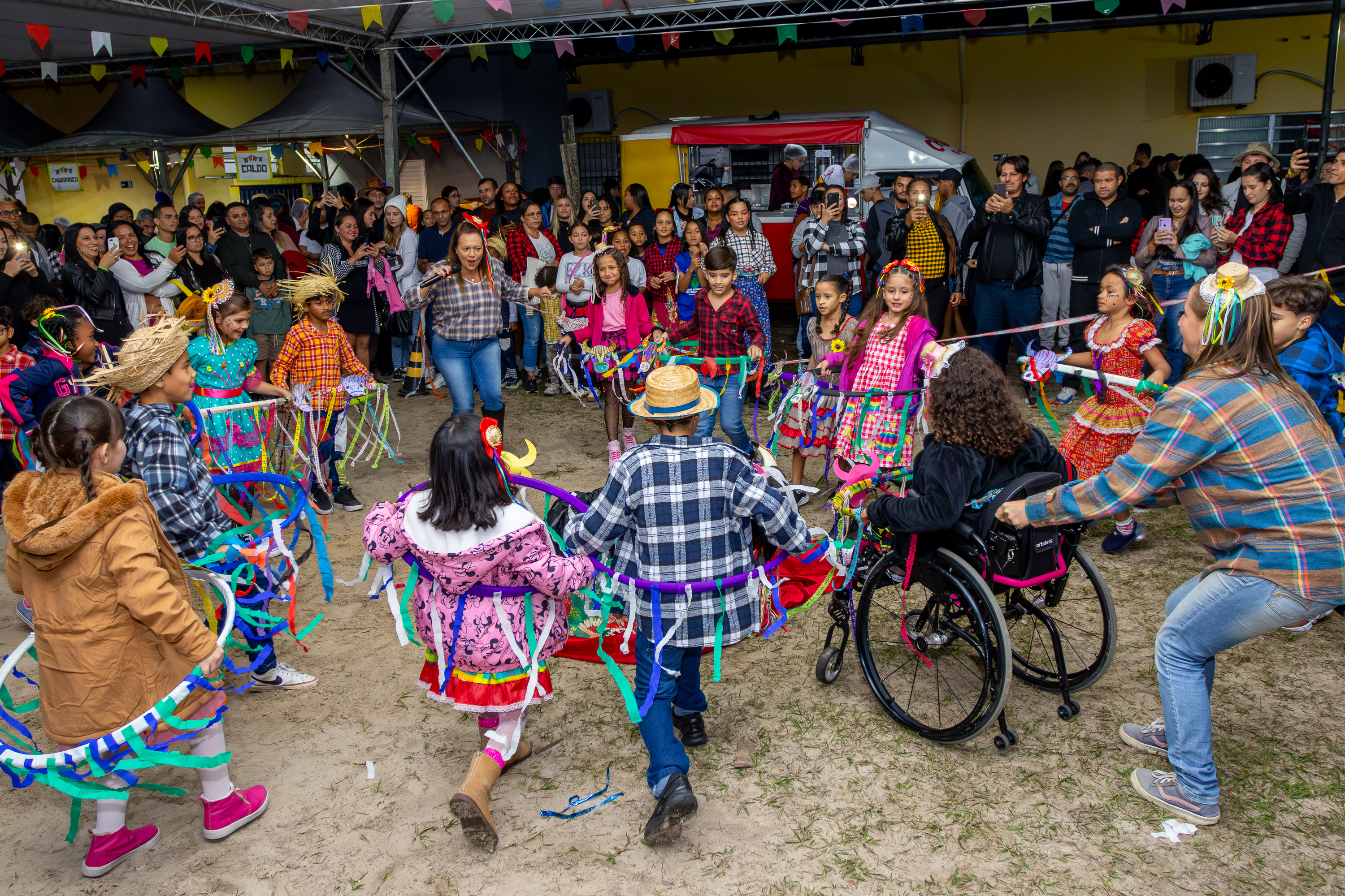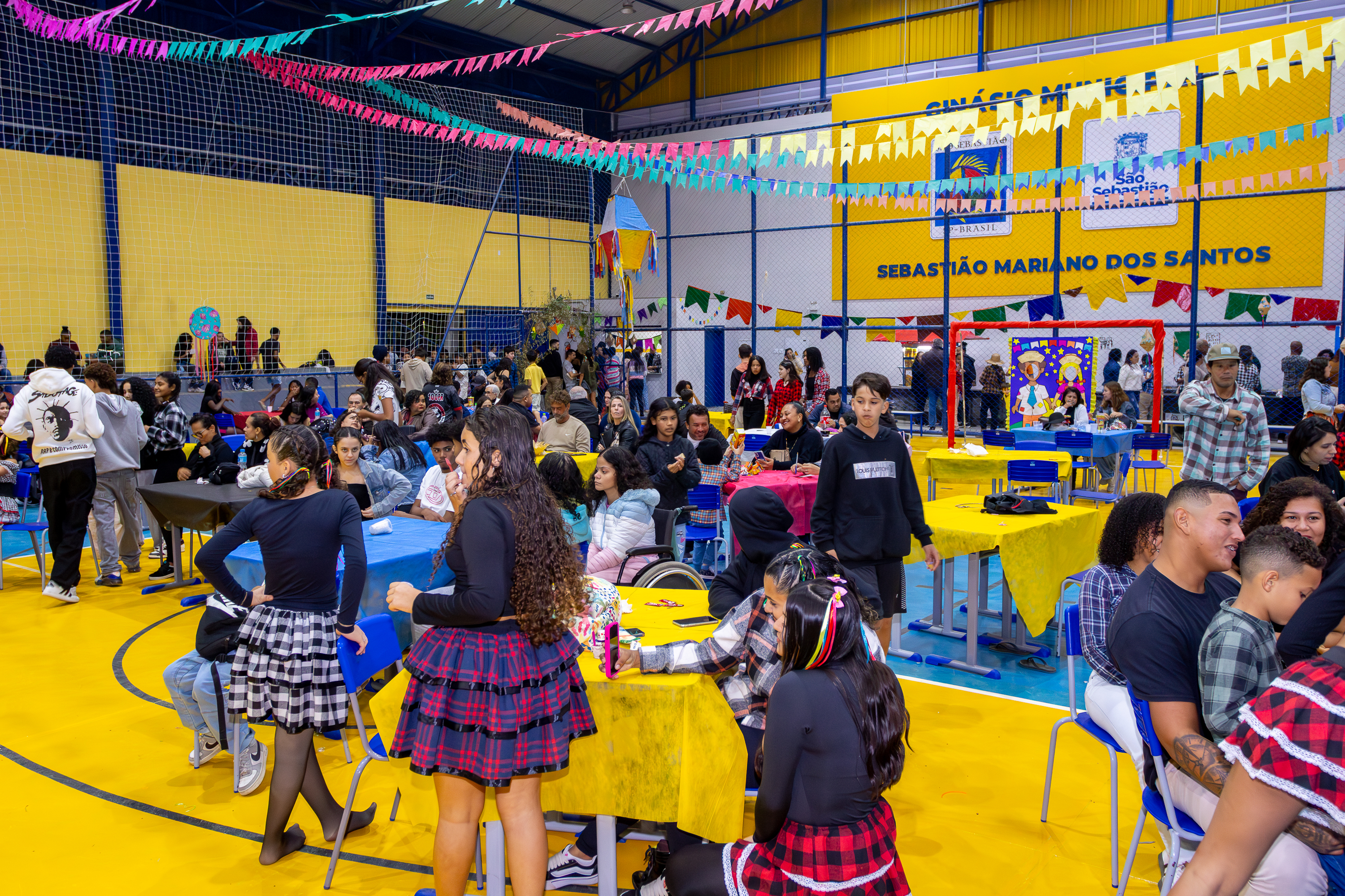 #PraTodosVerem: imagens mostram escolas da rede municipal de São Sebastião decoradas com bandeirinhas coloridas, repletas de alunos, famílias e educadores celebrando a Festa da Cultura Popular. Crianças e jovens, vestidos com trajes típicos juninos, participam de apresentações de dança, brincadeiras e confraternizações. Os ambientes estão tomados pelo clima festivo, com barracas de comidas típicas e atividades culturais que valorizam a tradição. Fim da descrição.