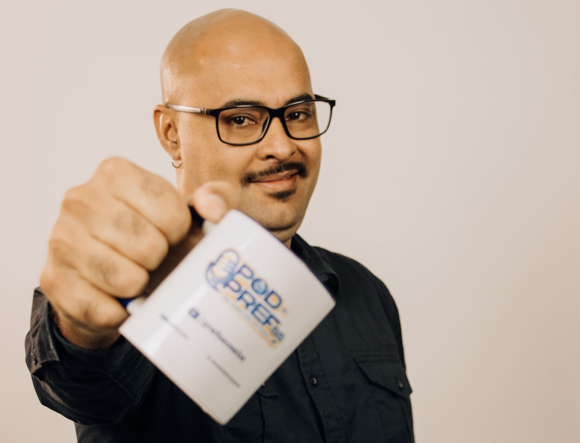#PraTodosVerem: arte institucional com fotos do pintor letrista Celso Pontes e do grafiteiro Vanderson Costa, o Biro, convidados do 11º episódio da 3ª temporada do Pod da Prefss. Além disso, tem fotos dos apresentadores Rafael César e Mara Cirino, apresentando o programa. Fim da descrição.