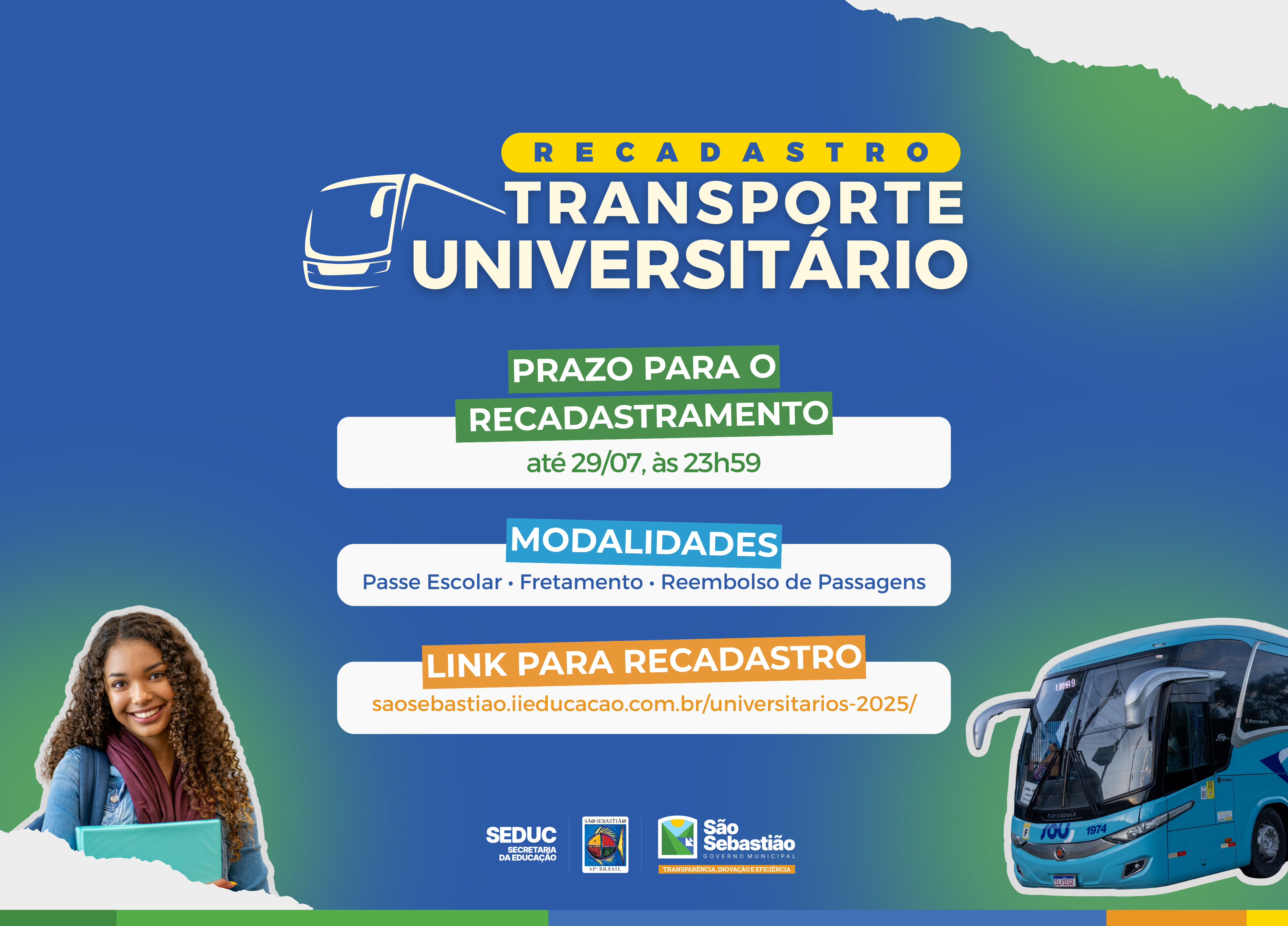 A Prefeitura de São Sebastião, por meio da Secretaria da Educação (Seduc), abriu o recadastro on-line para os estudantes universitários e de cursos técnicos que utilizam o benefício do transporte, seja municipal ou intermunicipal, nas modalidades Passe Escolar, Fretamento ou Reembolso de Passagens.