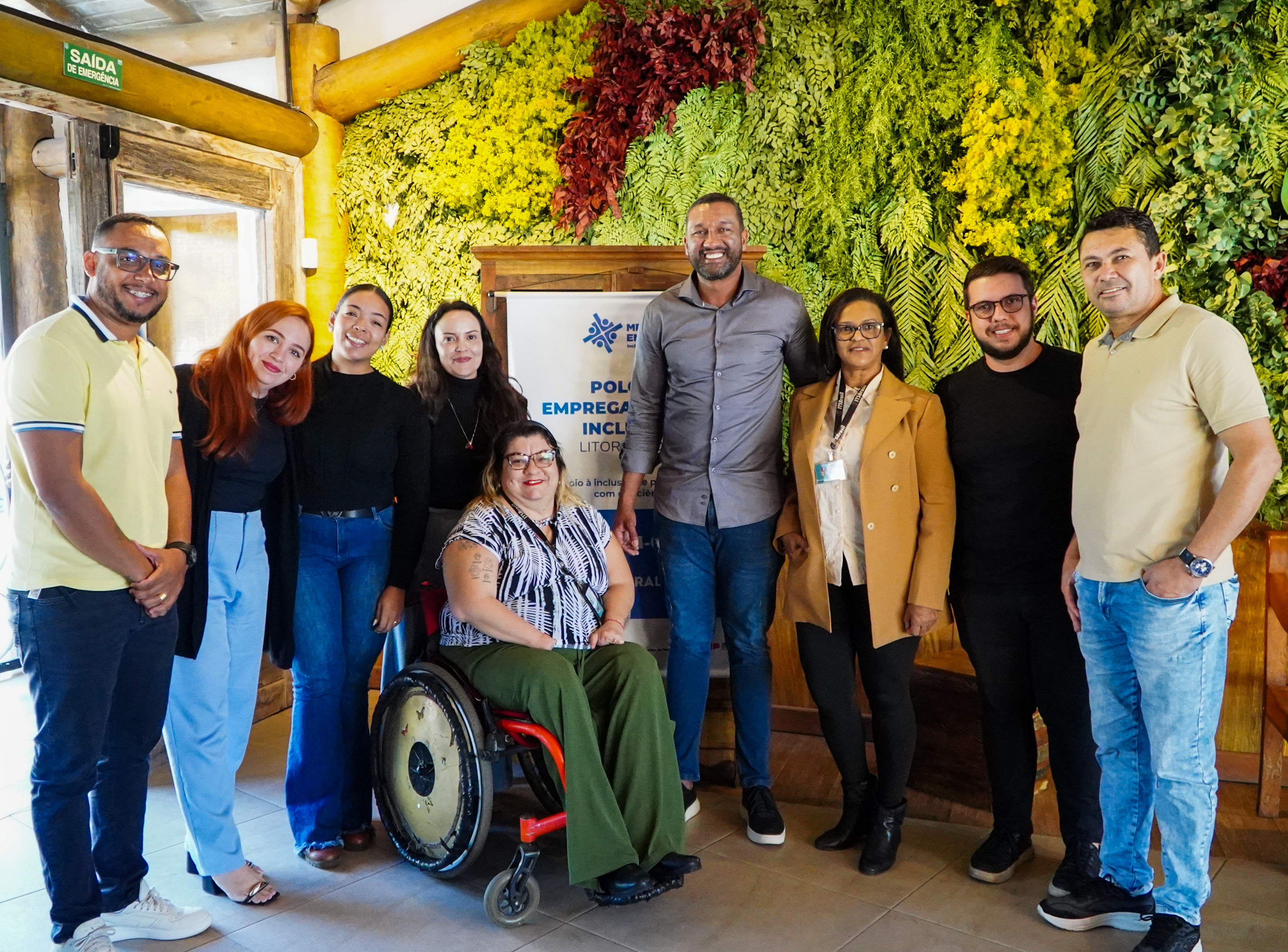 #PraTodosVerem: as imagens mostram um evento corporativo realizado em um ambiente com decoração rústica, repleto de plantas e luz natural. Na primeira foto, participantes estão sentados em mesas de madeira, atentos a uma apresentação feita por pessoas à frente, com um telão ao fundo. Na segunda, um homem fala ao microfone enquanto a plateia o observa. O ambiente é iluminado e acolhedor, com vigas de madeira e paredes claras. Na terceira, um grupo posa sorridente para uma foto em frente a um painel, incluindo uma mulher em cadeira de rodas. Na quarta, pessoas se servem de uma mesa com diversos tipos de pães, bolos e salgados. Fim da descrição.