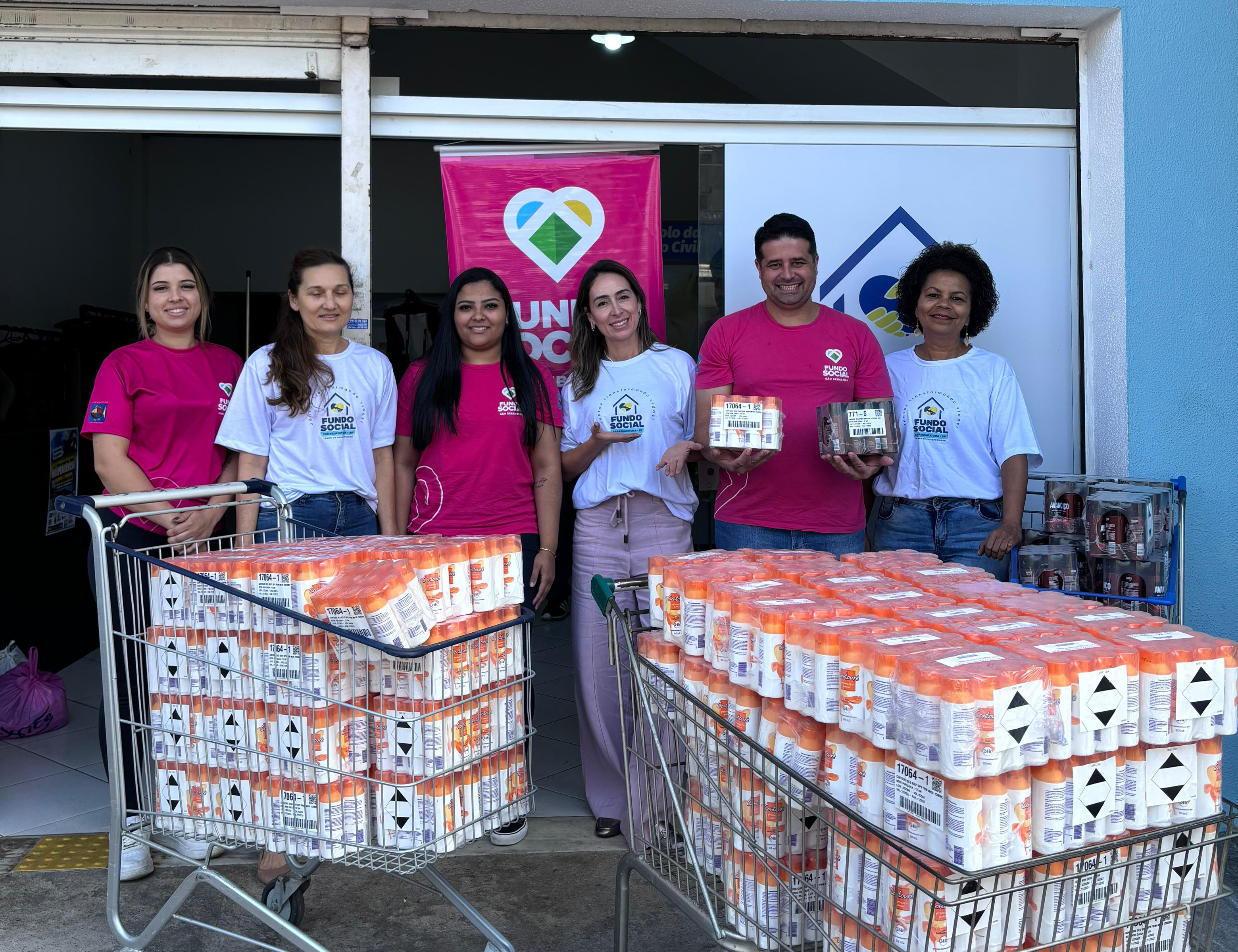 #ParaTodosVerem: Em frente a um prédio azul, integrantes do Fundo Social de São Sebastião e do Fundo Social de Caraguatatuba posam juntos em clima de parceria solidária, ao lado de carrinhos cheios de desodorantes doados. Em uma das imagens, representantes dos dois municípios trocam simbolicamente um kit de produtos, reforçando a união entre as cidades na construção de uma rede de solidariedade. Fim da descrição.