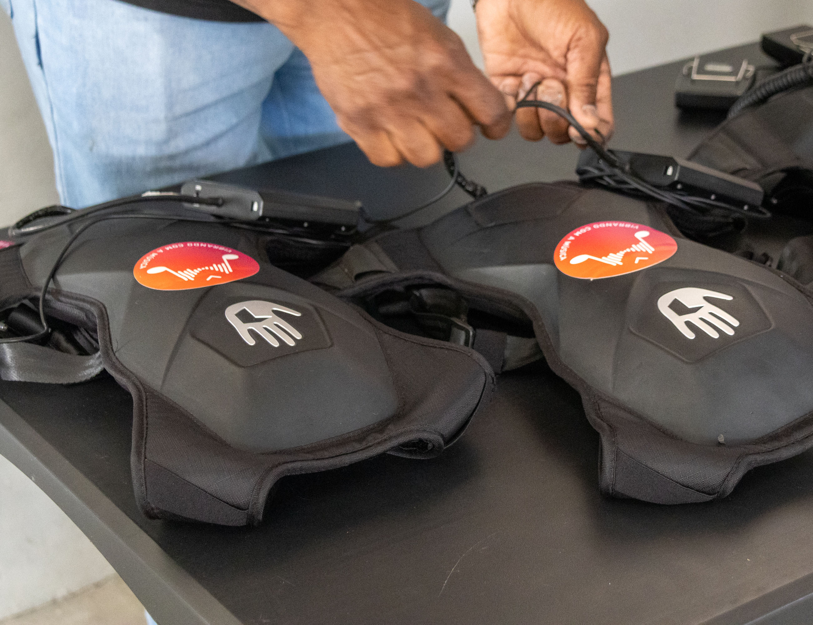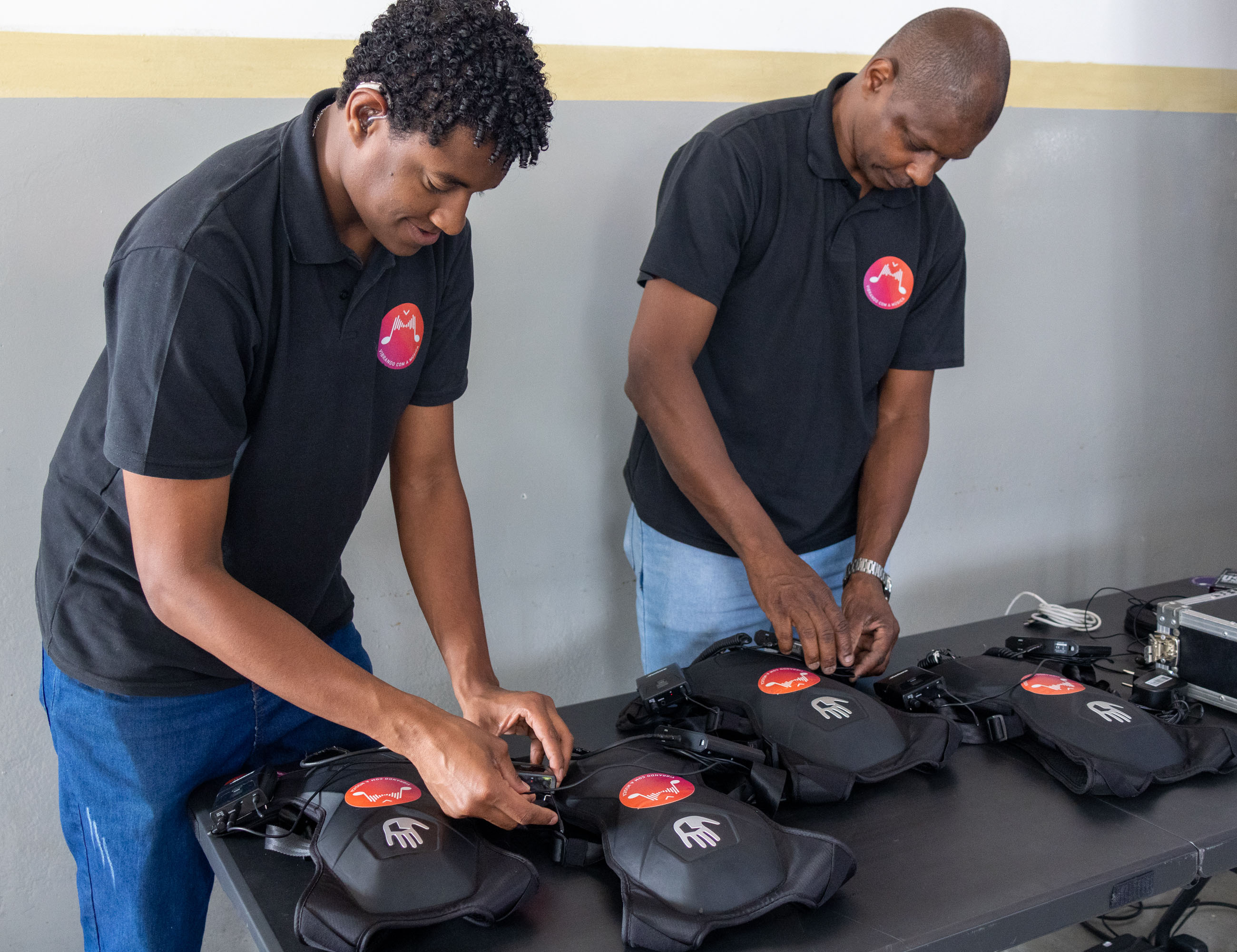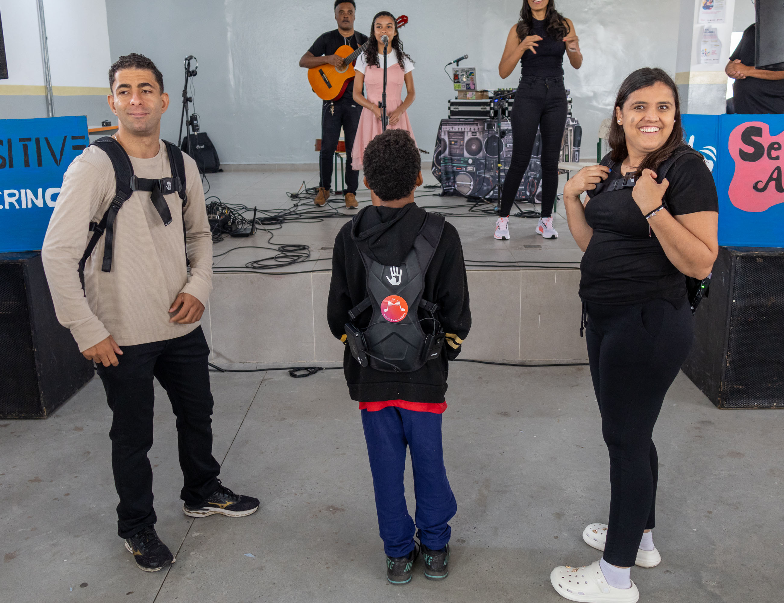 #PraTodosVerem: As imagens mostram momentos da 3ª edição do Sensitive Experience, evento inclusivo realizado em São Sebastião. Na primeira foto, dois homens com camisetas pretas organizam coletes vibratórios sobre uma mesa. A segunda imagem mostra três pessoas usando os coletes enquanto assistem a uma apresentação musical no palco, onde uma jovem canta acompanhada por violão e DJ. A terceira foto destaca em close os coletes pretos com símbolos de mão e adesivos coloridos. Já a última imagem registra um grupo diverso de homens e mulheres posando juntos em frente ao palco, em clima de confraternização e celebração do evento. Fim da descrição.