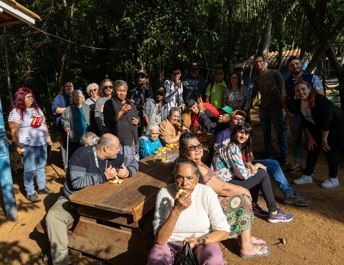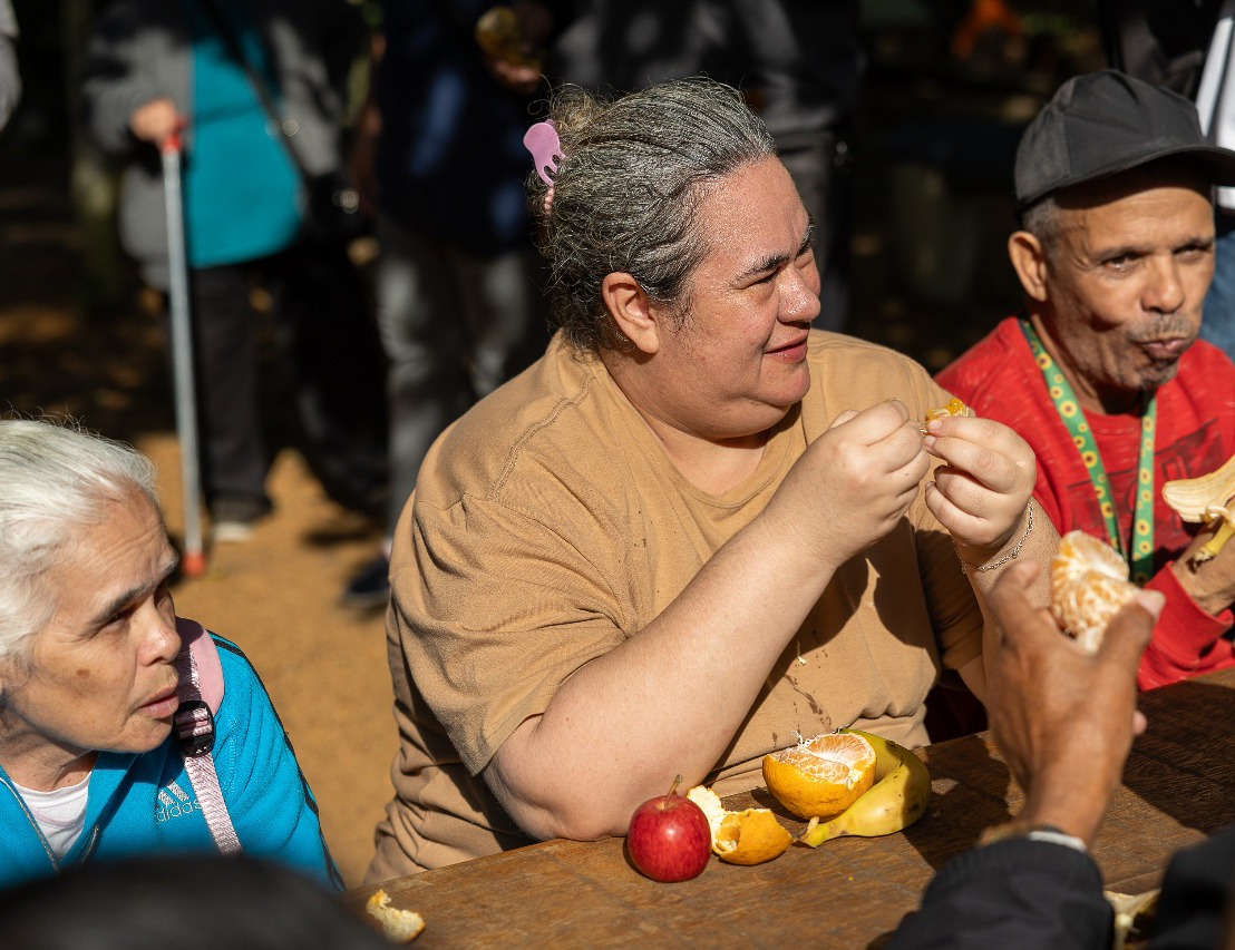 #PraTodosVerem: imagem de um grupo de pessoas reunidos entre homens e mulheres adultos e sentados num espaço ao ar livre em volta de uma mesa no centro e uma rua de terra, a outra imagem de duas mulheres adultas e um homem sentados nesse mesmo local comendo frutas e a última imagem retratada alguns adultos duas mulheres a frente e alguns homens atrás num local fazendo uma caminha ao ar livre. Fim da descrição.