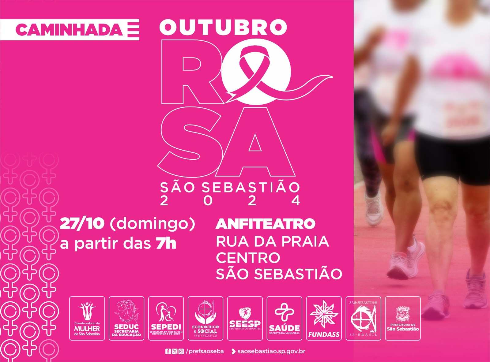 A Coordenadoria da Mulher de São Sebastião, em parceria com a Prefeitura de São Sebastião, por meio das Secretarias de Saúde (SESAU), Esportes (SEESP), Educação (SEDUC), Desenvolvimento Social e Econômico (SEDES) e do Idoso e Pessoa com Deficiência (SEPEDI), além da Fundação Educacional e Cultural de São Sebastião Deodato Sant'Anna (Fundass), promovem a Caminhada Outubro Rosa São Sebastião 2024, no dia 27 de outubro (domingo), a partir das 7h, com saída do Anfiteatro do Complexo Turístico da Rua da Praia, no Centro.