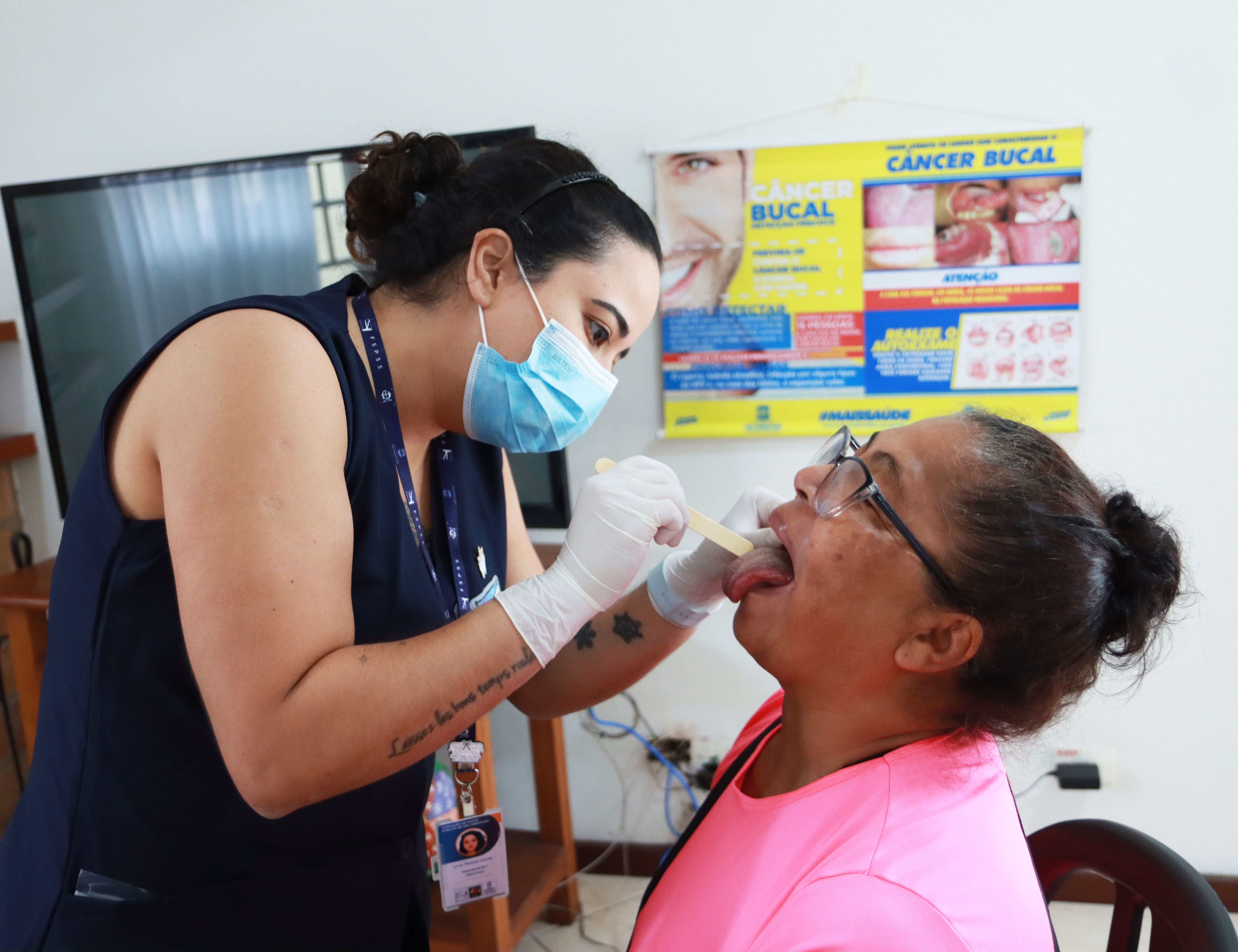 #PraTodosVerem: imagens de uma mulher sendo atendida por profissionais da área da saúde, na outra imagem um grupo de pessoas reunidas em sala recebendo informações e orientações sobre os cuidados da importância da prevenção á saúde bucal, mais uma imagem de uma mulher sendo avaliada por profissionais da saúde e a última imagem registra um grupo de pessoas que participou da ação. Fim da Descrição.