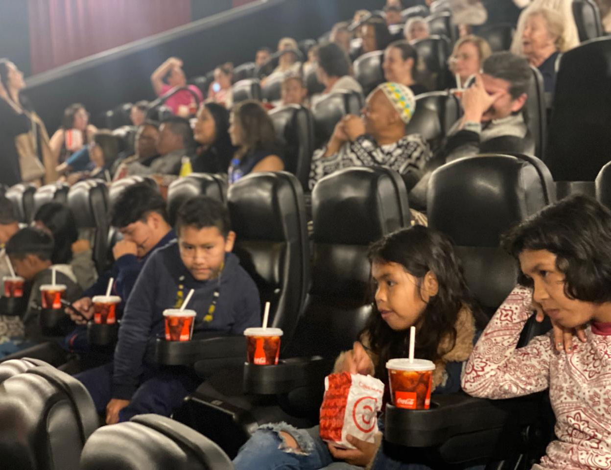 #PraTodosVerem: Sequência de fotos mostra crianças, jovens e adultos indígenas participando de uma sessão de cinema. Imagem de crianças e jovens indígenas conversando em mesas antes da exibição. Há também uma foto deles sentados nas poltronas com pipoca e refrigerante, assistindo ao filme. A última imagem mostra todos reunidos diante da tela, sorrindo e celebrando o momento. Fim da descrição.