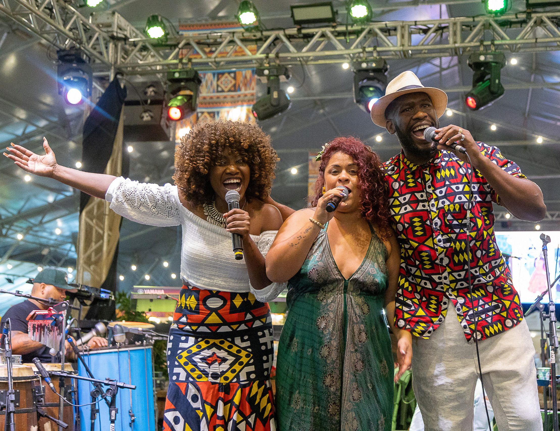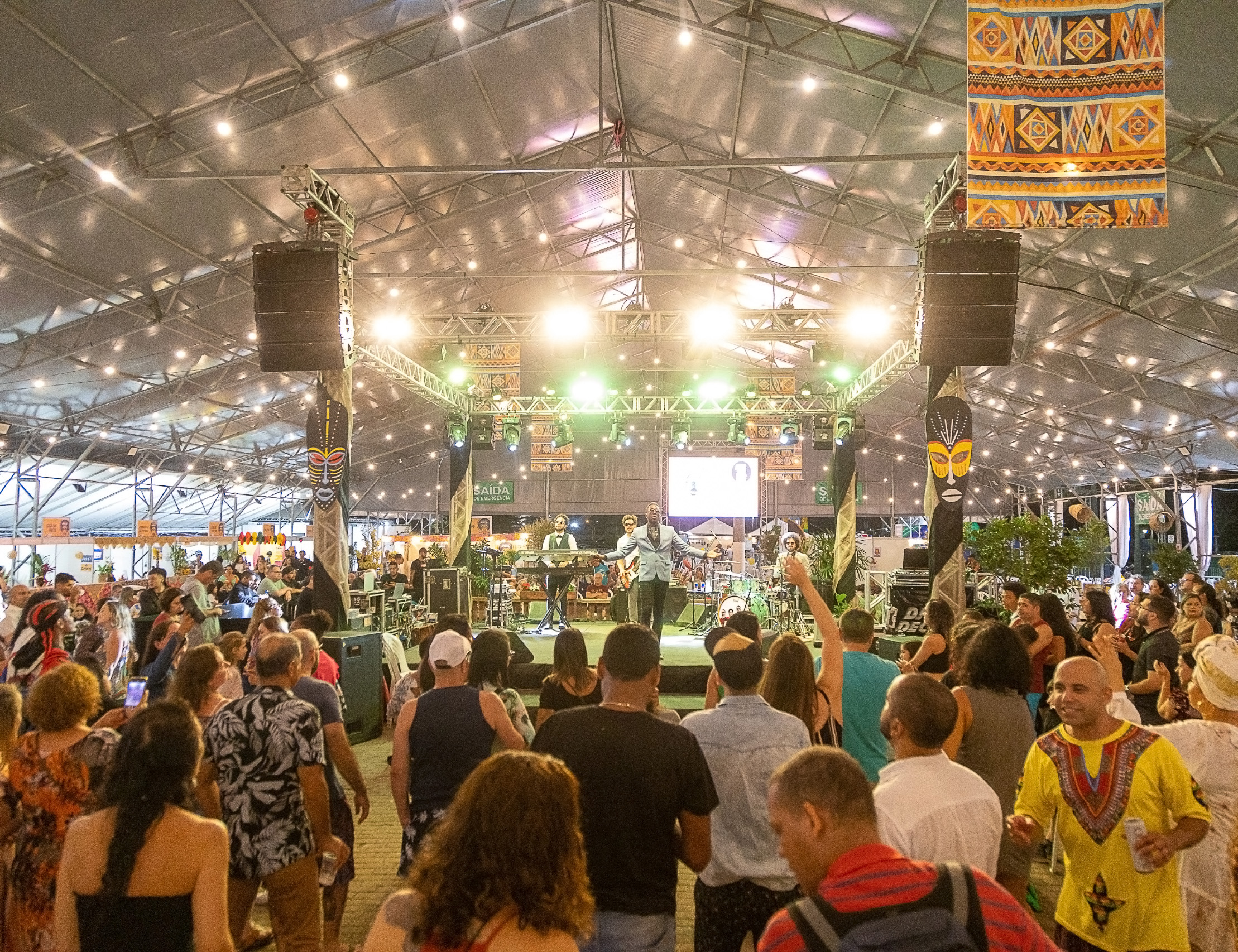 #PraTodosVerem: As imagens documentam um festival cultural com foco em música, arte e culinária afro-brasileira, realizado em um palco e iluminação. A primeira foto mostra a plateia animada assistindo a uma banda no palco. A segunda exibe manequins com trajes africanos e peças artesanais em um estande decorado. A terceira foto é um close-up de três cantores, duas mulheres e um homem com chapéu, sorrindo e cantando no palco. A quarta imagem mostra um prato de acarajé, com camarões e vinagrete, sobre uma folha de bananeira. Fim da descrição.