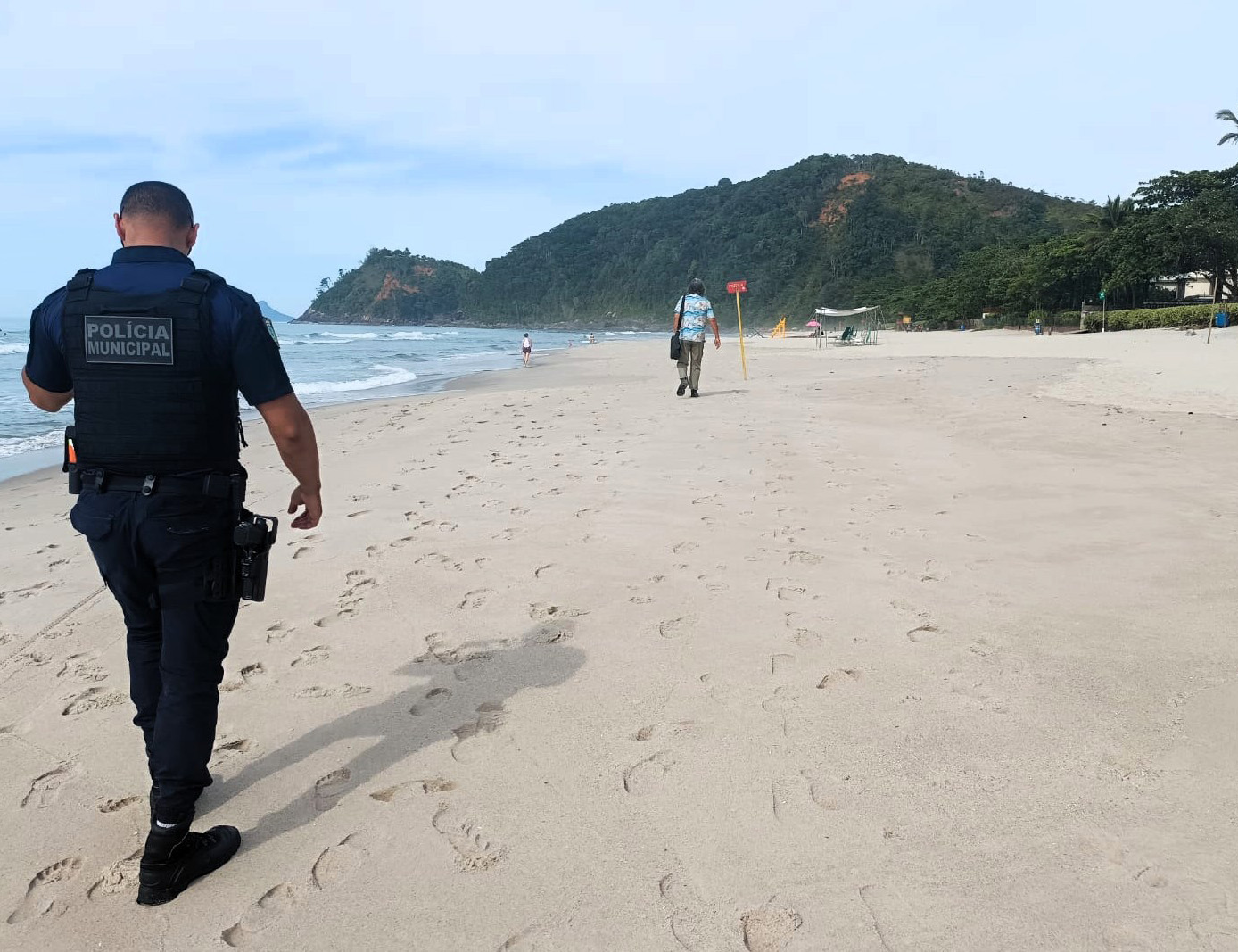 #PraTodosVerem: Registros da ação de fiscalização de animais domésticos na Praia de Cambury mostram, sob um céu claro e em meio a uma paisagem cercada por morros verdes, um guarda da Polícia Municipal fardado caminhando pela extensa faixa de areia enquanto monitora a orla. A fiscalização abrange diferentes pontos, exibindo um cão de pelagem branca e marrom farejando o solo próximo a cadeiras de praia vazias, além de um agente com prancheta e crachá conversando e orientando uma banhista à beira-mar, momento em que outro cachorro de médio porte é visto correndo próximo às ondas ao fundo. Fim da descrição.