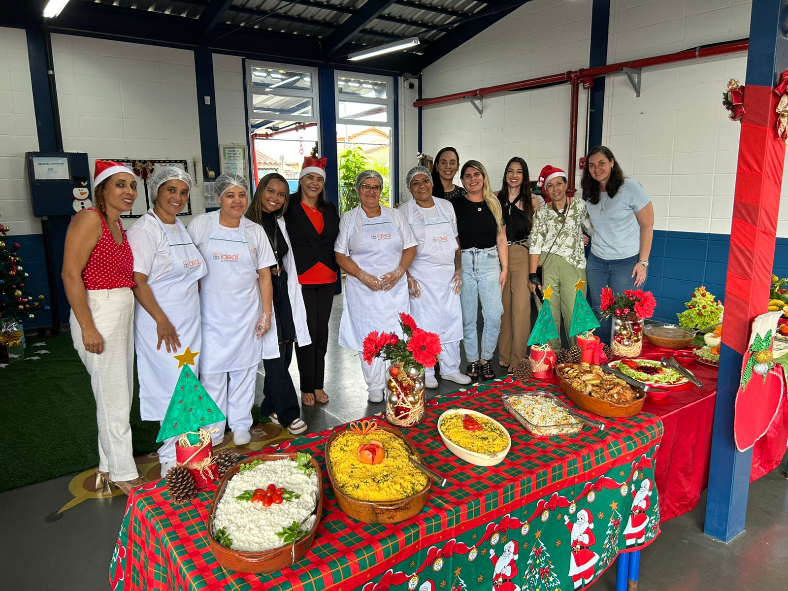 #PraTodosVerem: Conjunto de quatro imagens de um almoço natalino escolar, com crianças sorridentes sentadas em mesas decoradas, saboreando pratos com arroz, feijão, frango e sobremesa. Em uma das fotos, a equipe de merendeiras posa uniformizada atrás de um buffet festivo com toalha de Papai Noel e enfeites temáticos, enquanto as demais mostram os alunos interagindo e o detalhe aproximado da refeição servida. Fim da descrição.