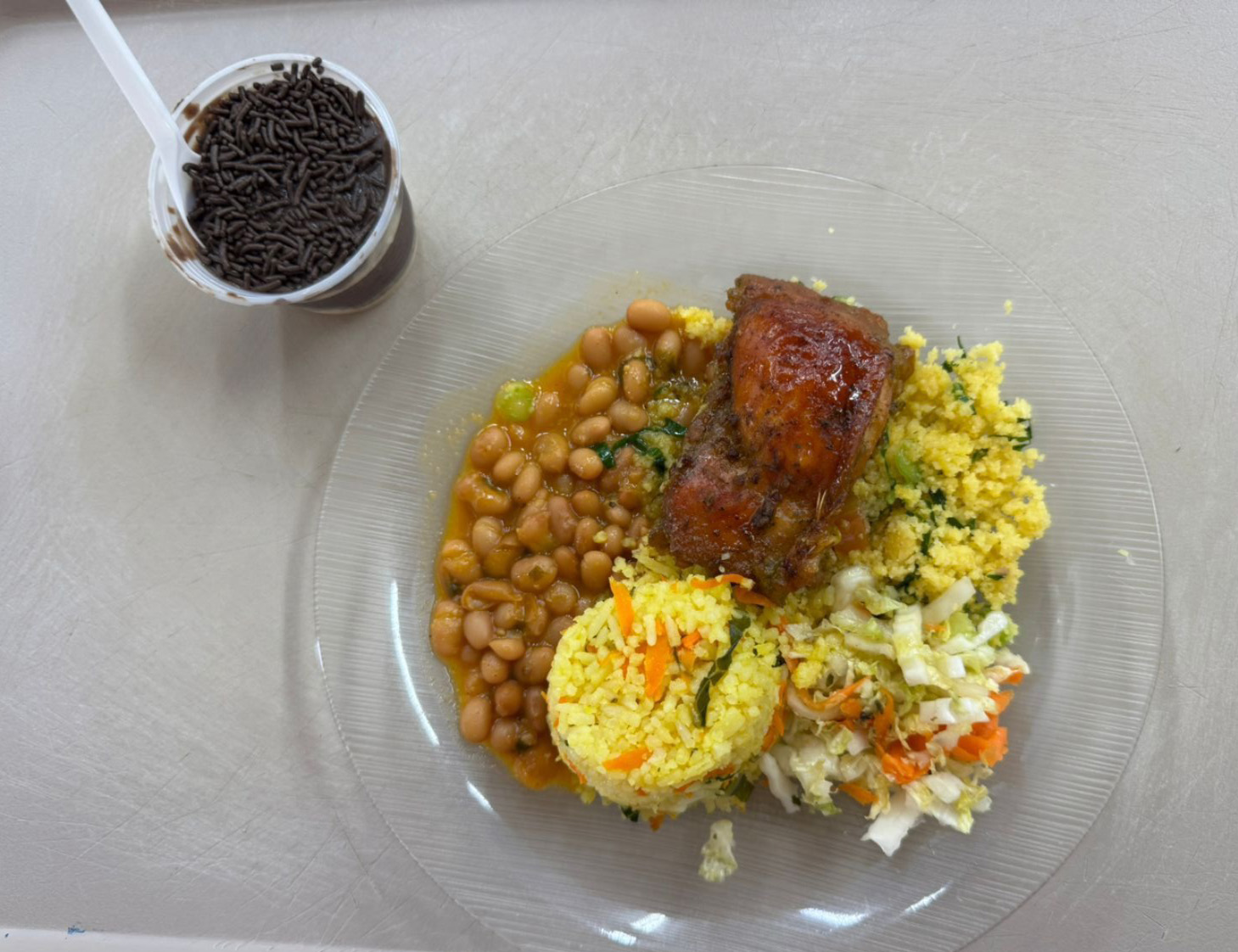 Elaborado com variedade, equilíbrio e cuidado nutricional, o cardápio oferecido aos estudantes incluiu arroz à grega, farofa de cuscuz, sobrecoxa assada e suco de frutas. Como sobremesa, foi servido pavê, preparado pelas equipes de alimentação escolar, seguindo rigorosamente os padrões de segurança alimentar e as orientações nutricionais.