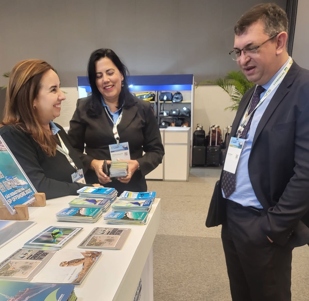 #PraTodosVerem: sequência de imagens gerais do evento SP Offshore Conference 2025, com servidores públicos da Setur apresentando as folheterias turísticas aos visitantes. Fim da descrição.
